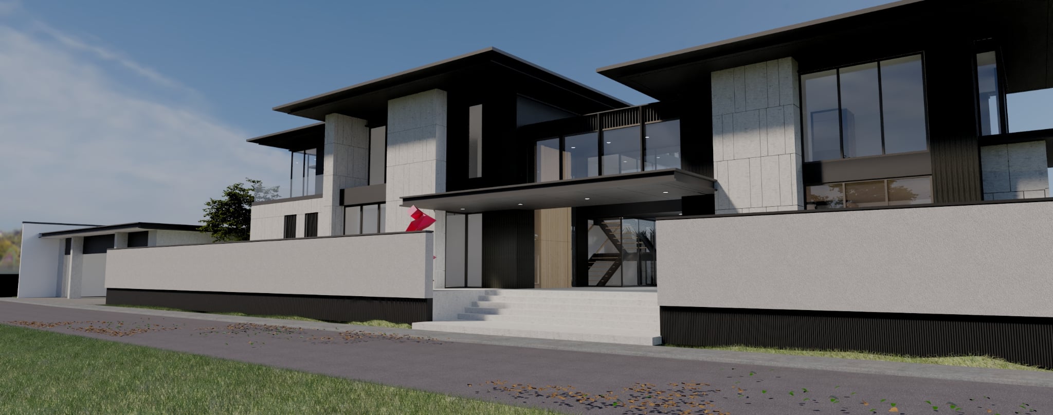 modern minimalist architecture sleek large house with sharp angles white concrete walls black accents reflective glass windows bright blue sky soft white clouds green grass in the foreground dark asphalt driveway with scattered autumn leaves in shades of orange and brown subdued and tranquil atmosphere with natural lighting highlighting the textures and lines of the structure