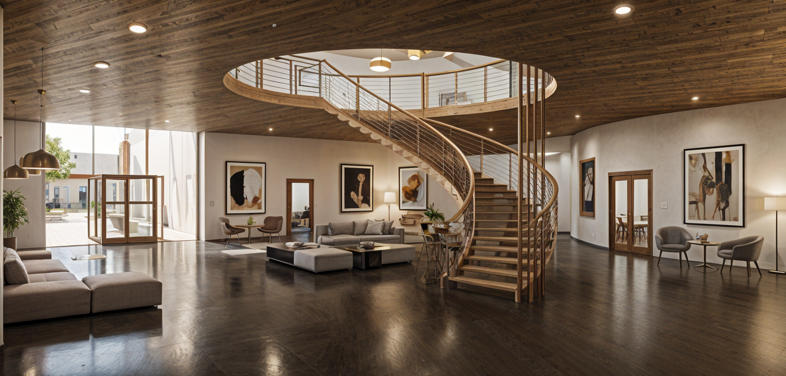 modern minimalist kitchen interior featuring sleek white cabinets and warm natural wood accents the kitchen island has a dark charcoal finish complemented by four elegant white high stools pendant lights hang above the island with a matte black and silver finish the countertop is a polished concrete gray and a stainless steel refrigerator is neatly integrated the ceiling is a smooth deep gray contrasting with the light gray marble floor tiles bright natural lighting floods the space through large windows creating a serene and sophisticated atmosphere i want some elemets object with a minimalist design