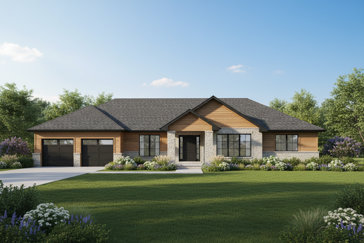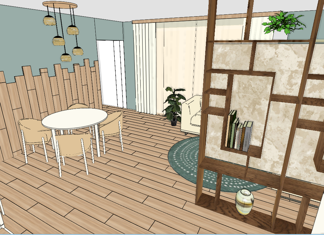 please make the picture have a pleasant scandinavian atmosphere the wall is the color of rosemary branches the dining table is round and white the 4 dining chairs are medium beige with white legs behind the dining table the floorboard runs up the wall which is a natural oak color on the right edge the back of the stand is not completely covered you can see through it from below and above the round carpet is a bluish shade and there is also a soft beige shade on the window in front of the curtain the windows start from the floor through the window we can see a green landscape