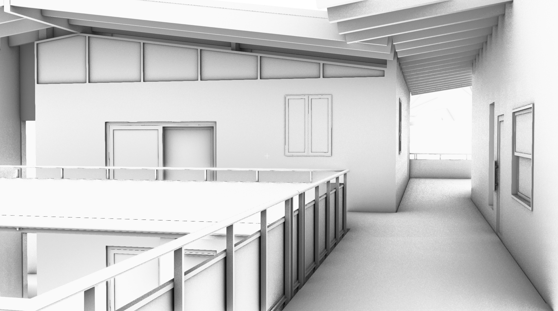 render this scene exactly following the geometry proportions and perspective of the original image a balcony perspective view of a residential building that has a gable roof form and a clerestory window the perspective shows balcony railings roof overhangs and clt roof beams do not change any forms or structure apply a warm realistic architectural style inspired by scandinavian and contemporary timber housing the building should be clad in vertical timber shiplap with visible cross laminated timber clt beams beneath the roof use soft natural daylight filtering through the open areas creating gentle shadows and a serene lived in atmosphere surfaces should have realistic material textures warm wood tones matte finishes light concrete or plaster and subtle reflections add a sense of quiet life with soft light bouncing from the floor and railings style keywords photorealistic architectural rendering warm natural light timber architecture minimalist realism vertical shiplap cladding clt beams human warmth scandinavian calm soft tonal contrast handcrafted materiality natural textures serene atmosphere architecture