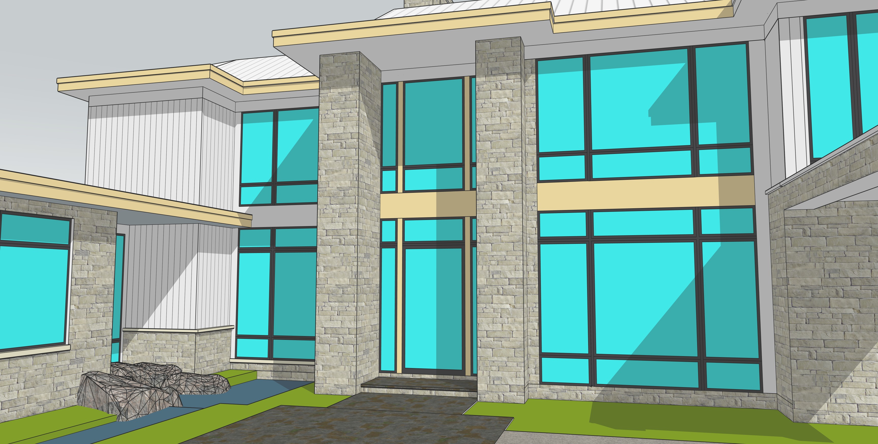 vertical stained light color taupish stained wood siding dark gray gray standing seam metal roof fascial matches siding color black window frames flat roofs to be a grayish color living roof on top of stone opening pass through blend roof into landscaping show with lush landscaping dusk setting smaller trees in the foreground on hillside integrate grasses on hillisde into living roof light coming from windows more sod like grass