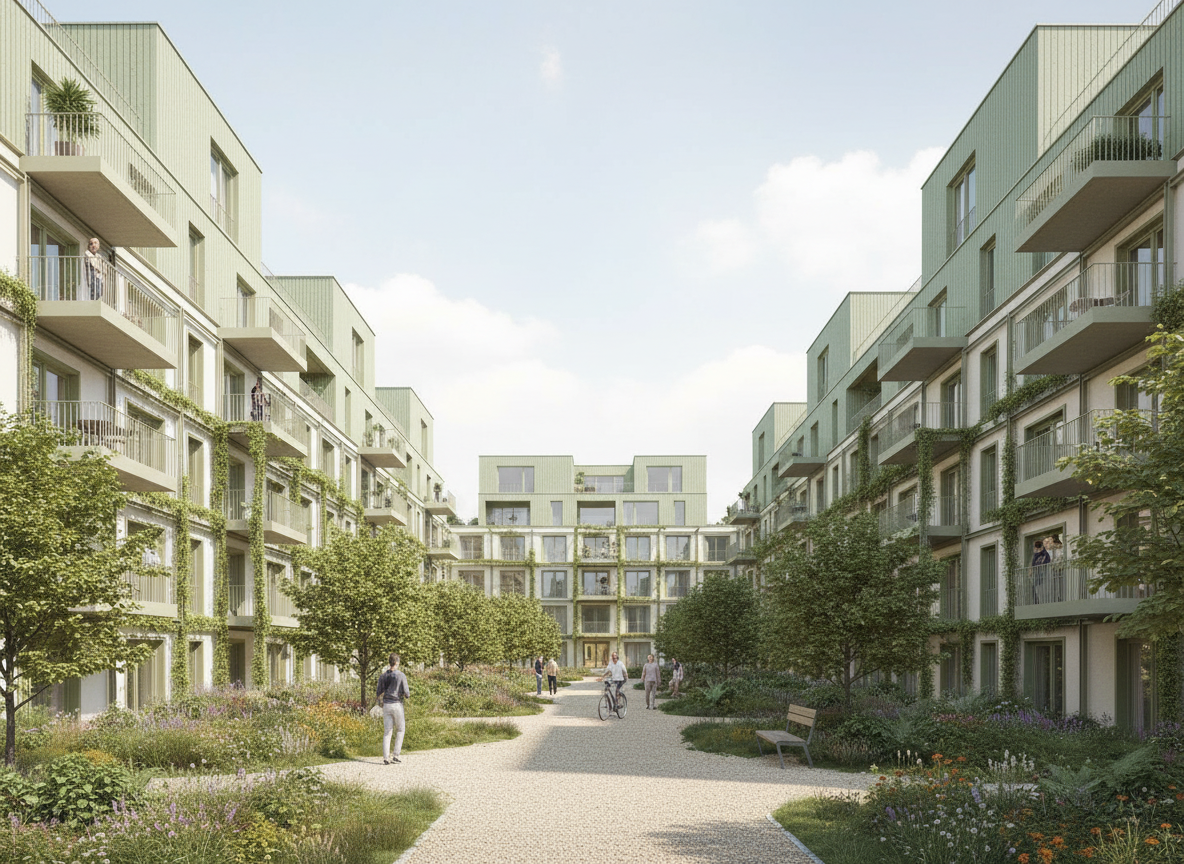 residential 6 stories building with linear central green allay no u shape building only linear no vegetation on the building building in the middle at the end off the linear park