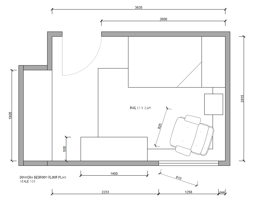 create a room view using the attached floor plan and measurements north wall 3635mm with an entry to the room door on the left east wall 2615 mm south wall with a window on it and west wall with 1905mm niche for built in robe put a king single size bed 2170 mm long and 1140 wide with charcoal boxed bedhead charcoal sheets and navy pinstripe duvet cover to the corner of the room long side along the north wall bedhead in the corner of the north east walls add a round bedside table next to it 450 dia walnut top and gunmetal base grand designs asher side table 1pcs gunmetal walnut on the opposite south wall place a togo lazy caterpillar lounge chair in tan leather with a smaler side table with walnut top and gunmetal base 350mm dia next to it place a drexel dome floor lamp behind the chair with aluminium base and clear glass shade 1300 mm height all walls and ceiling are painted in dulux opononi double
