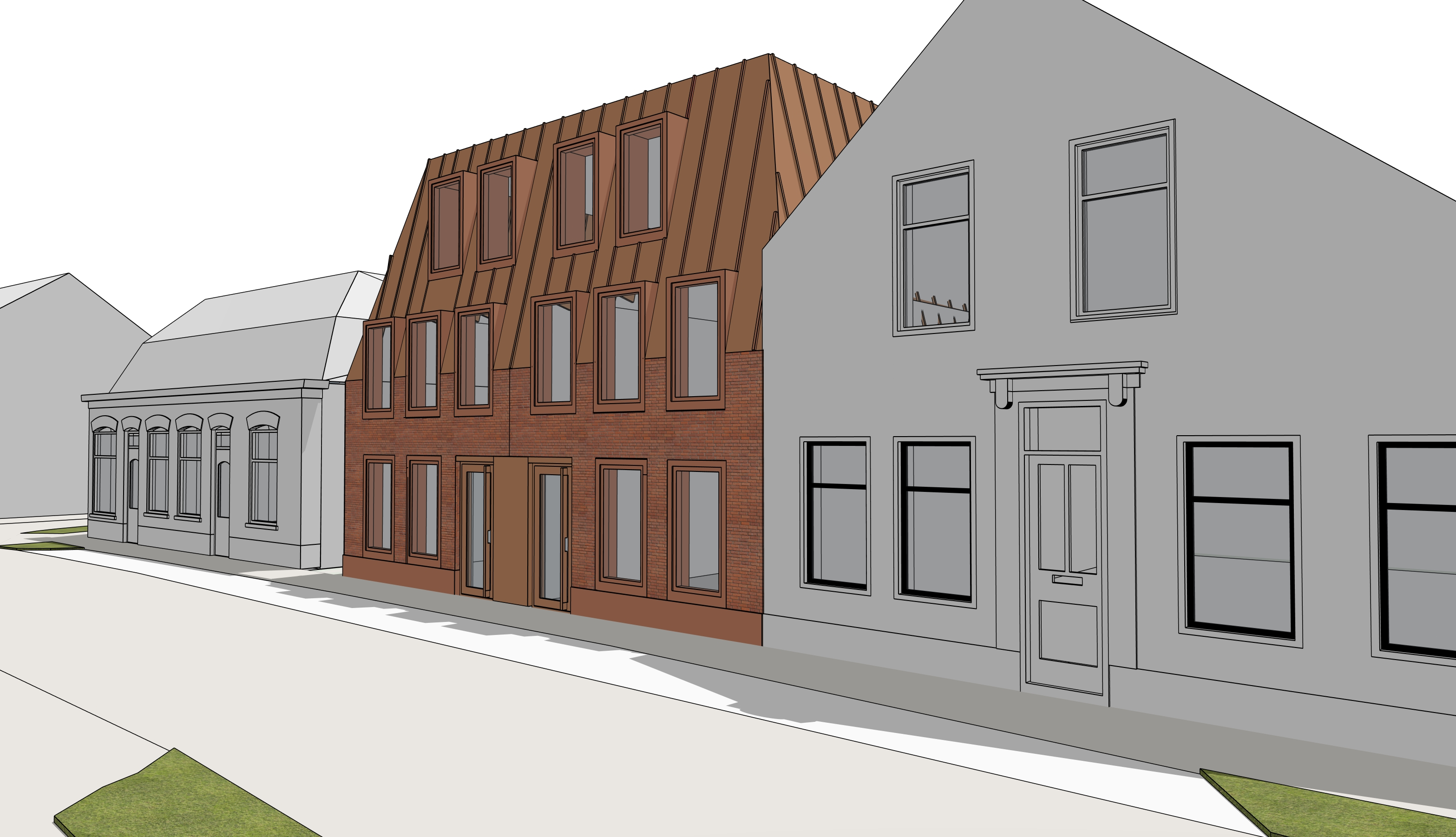 create a warm and inviting residential courtyard scene inspired by contemporary dutch architecture the main buildings should feature fa ades made of red brown mottled brick and window frames in an orange red brown tone the roof detailing must consist of vertical panels in a red brown color with a matte weathered texture adjacent buildings may appear more abstract while still maintaining a sense of neighborhood cohesion and should be entirely bright white with glass to create contrast between the sidewalk and the bottom edge of the window frames include a trasraam plinth made of pigmented concrete in the same color as the window frames depict an autumn like day in the netherlands with soft slightly diffused daylight and gentle warm tones on the right side of the scene include a green tree with autumn foliage in front of the buildings on the left side of the street add an additional tree include a pedestrian sidewalk and use traditional dutch style brick pavers for the street surface add subtle landscaping and a few people walking or cycling to create a calm community oriented atmosphere
