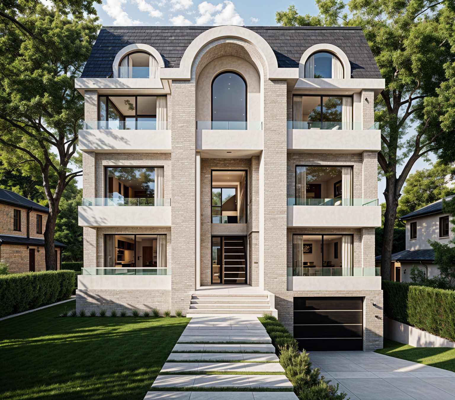keep the building but change the background to have less trees and be in a neighborhood