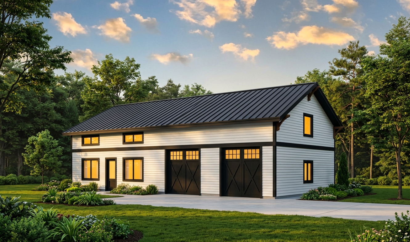 clean modern barndominium architectural exterior home rendered in cinematic vibrant golden hour lighting with blue skies and vibrant clouds barndominium in a lush beautiful forest setting with green grass and dense trees surrounding the property warm glow and reflections off of the windows select grade horizontal white hardie siding green manicured landscape around structure with gardens and grass black standing seam metal roof high fidelity photorealistic visualization crisp shadow falloff refined facade geometry soft atmospheric depth premium architectural photography mood ultra clean composition and materials photorealistic render black trim around the windows and doors prominent trees scattered around the property black window trim and posts concrete driveway leading to the black garage doors black man door white belly band