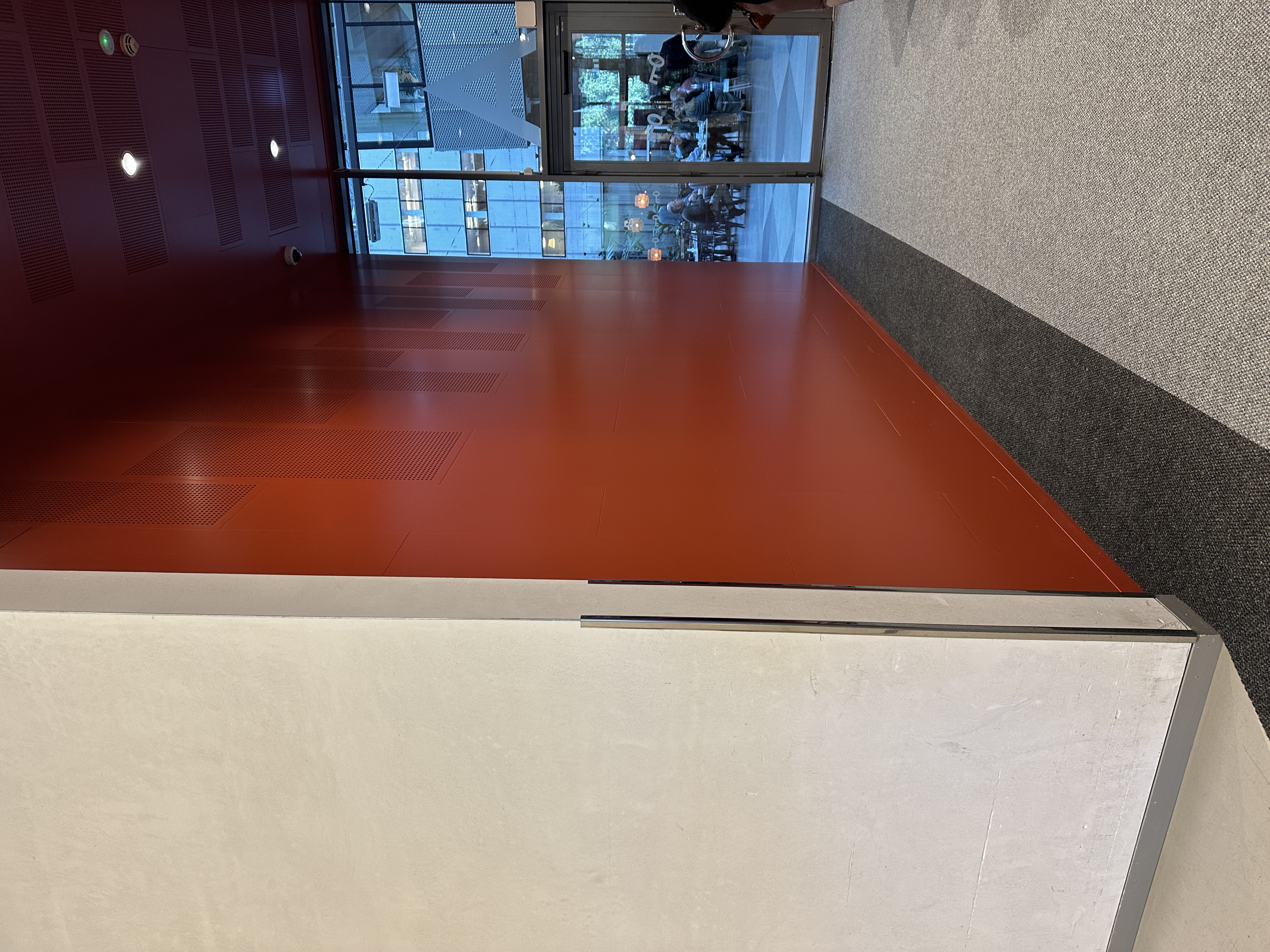 add a walnut wood panel ont the bottom of the red wall proximately to the half height ot the wall the panel shpud only cover half of the red wall not the light beige wall