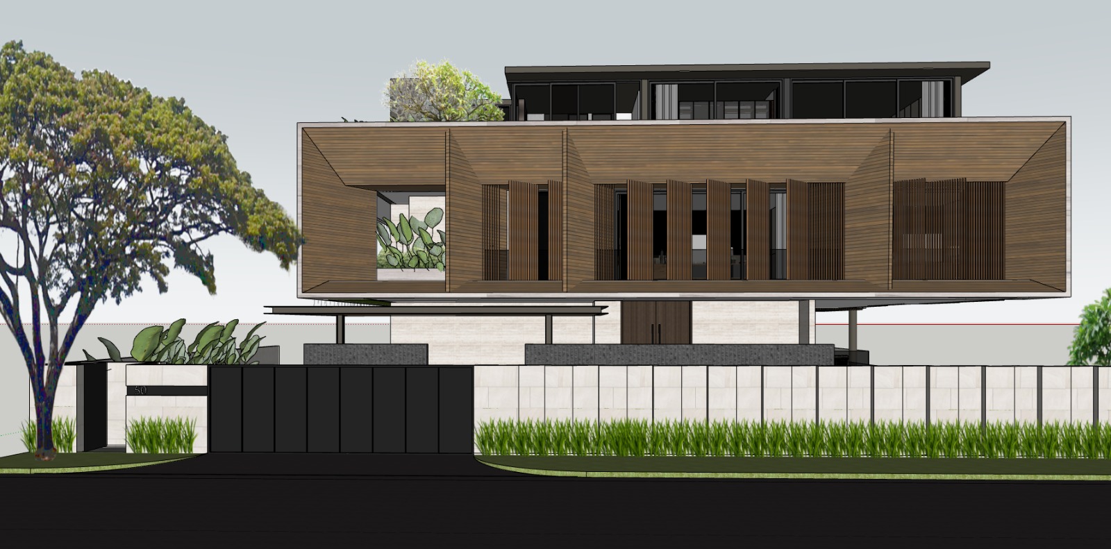 generate a highly photorealistic exterior architectural rendering of the project core requirement strictly preserve all architectural geometry proportions and design intent do not modify any structural elements or spatial relationships composition very important vertical or slightly portrait framing preferred view should capture depth layering of spaces connection between levels include foreground midground and background for spatial richness lighting natural daylight late afternoon preferred warm soft sunlight with long shadows highlight depth texture and spatial layering avoid overexposure or dark moody scenes materiality render all materials accurately timber warm natural grain concrete subtle texture variation stone depth and realism metal soft reflection avoid flat or artificial finishes landscaping enhancement allowed introduce lush well composed landscaping trees soft planting greenery integrated into architecture landscaping must enhance the architecture not dominate it atmosphere calm refined high end residential feel slight human presence optional subtle not staged rendering quality ultra high resolution photorealistic comparable to professional architectural photography goal create a striking competition level hero image that communicates the architectural concept clearly and beautifully
