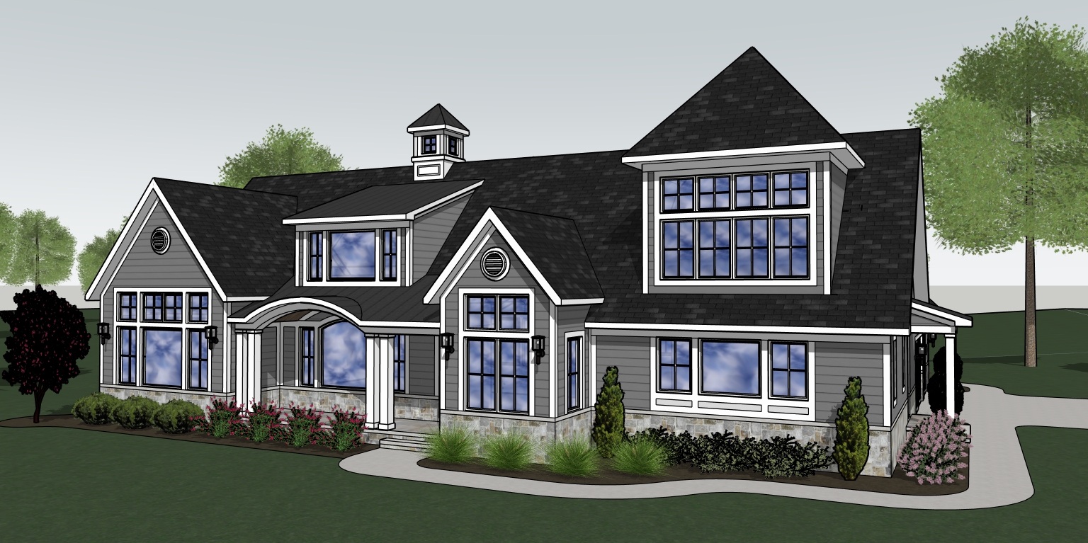 partly cloudy sky deciduous trees in background white windows make lake erie reflected in windows