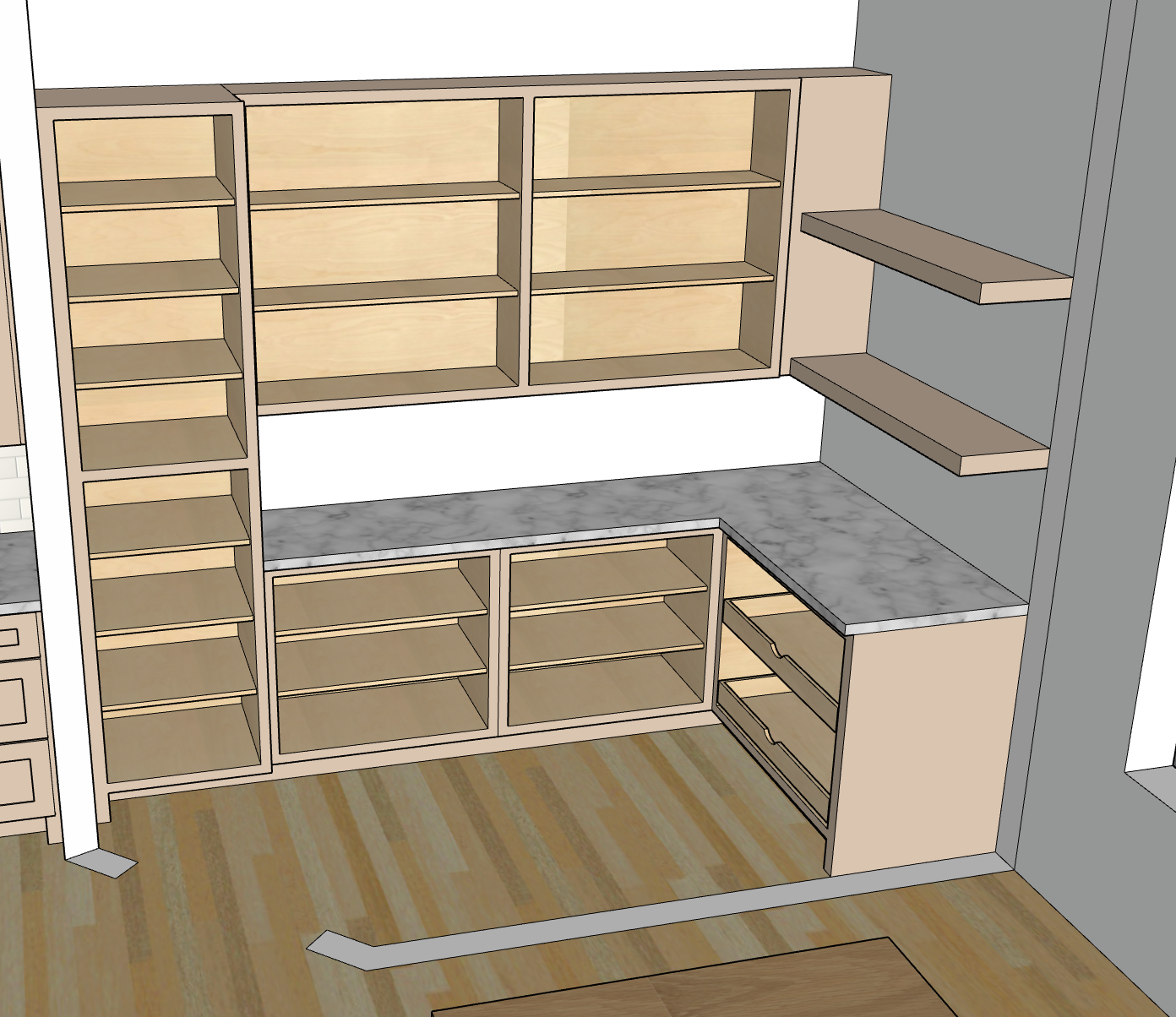 make face frames and floating shelves painted cream inside of all cabinets and cabinet shelves birch plywood
