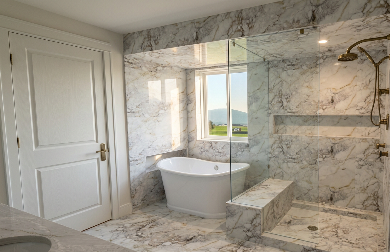 create a beautiful architectural rendering of modern row houses with brown brick facades and dark gray rooftops the scene includes lush greenery and trees with green and yellow leaves casting soft shadows the atmosphere is serene with a pale blue sky and soft lighting that highlights the architectural features people can be seen walking in the foreground adding a sense of life to the peaceful urban environment there is no street in between the houses but front an back gardens with green lawn