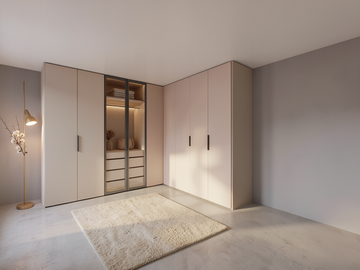 armadio con ante bianche e mensole in legno dentro l armadio metti dei vestiti e la mensola sopra al cassetto in vetro e fa vedere il contenuto del cassetto sotto sopra ci sono tre faretti bianchi accesi luce calda