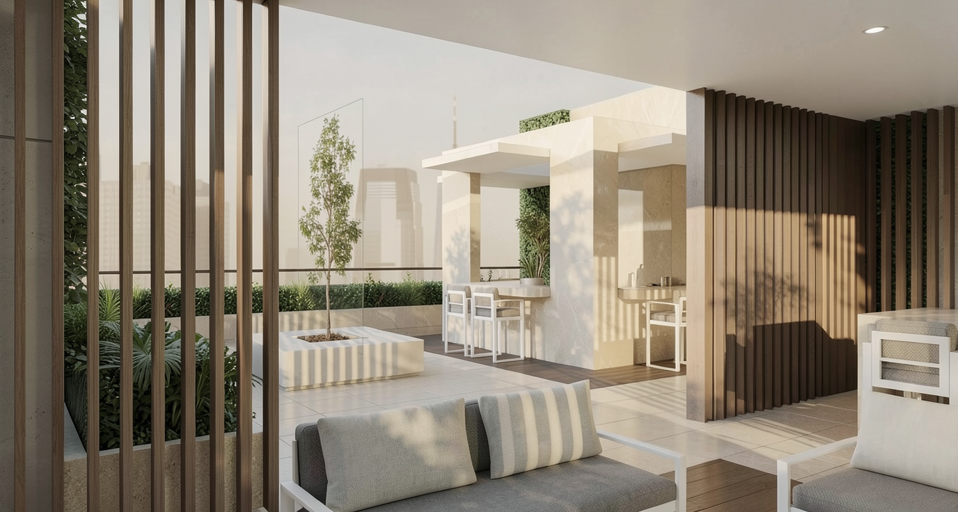 render a modern rooftop terrace with a sophisticated and serene atmosphere the background features a soft sepia skyline with a light gray sky add lush green vegetation along the edges incorporate sleek white and gray furniture ensure limestone elements have a honed beige finish include subtle natural shadows soft ambient lighting and a calm urban vibe white ceiling over room realistic tree in planter no people