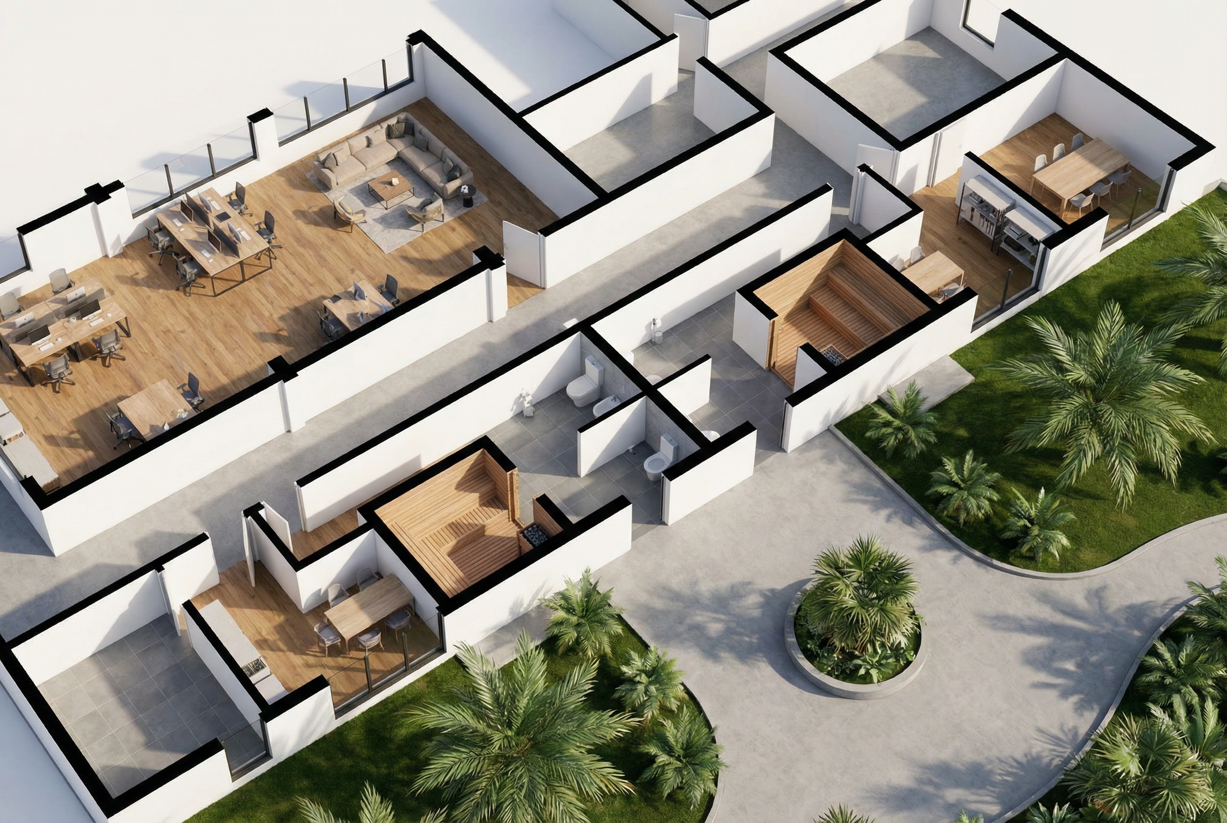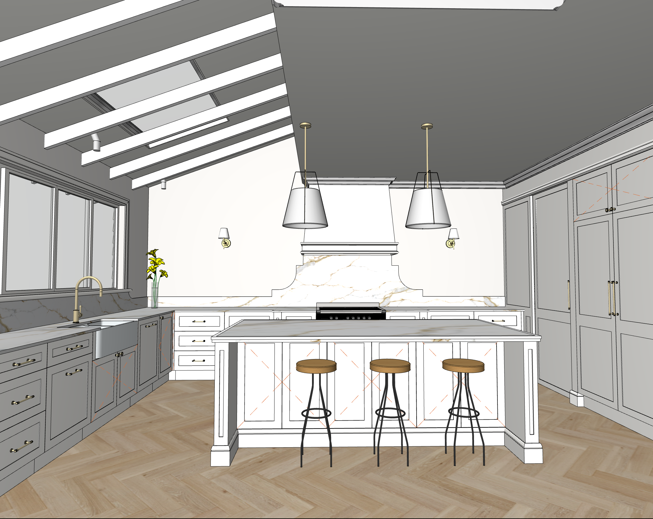 render a luxurious modern kitchen interior with elegant neutral tones use soft cream colors for the walls and cabinets incorporate marble countertops with subtle gold and gray veining add warm natural wood tones for the stools and herringbone floor enhance with sleek metallic fixtures and handles in brushed gold create a bright inviting atmosphere with soft ambient lighting and touches of greenery for a fresh sophisticated look