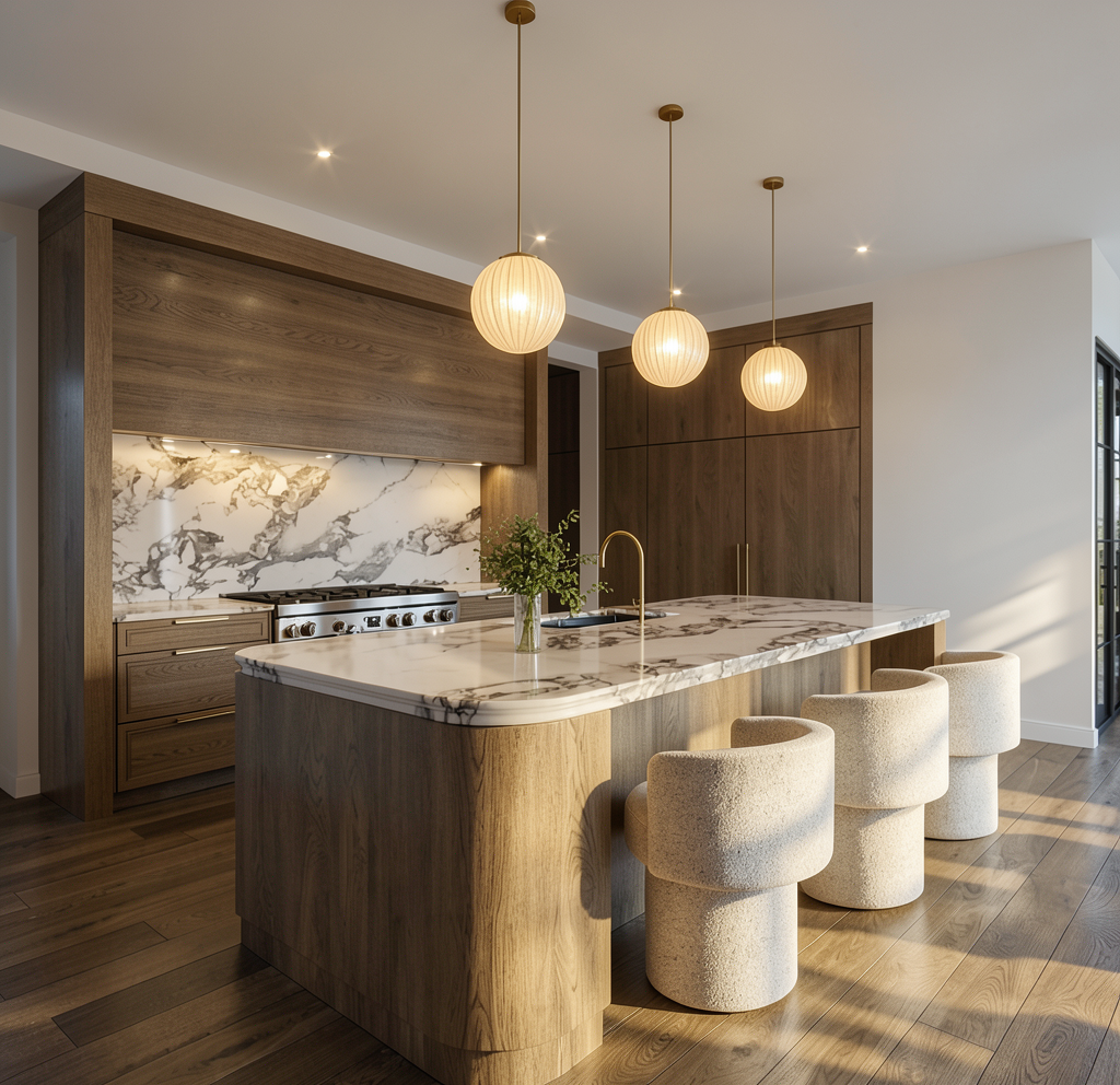 carlo scarpa exterior shot render a charming modern farmhouse with a welcoming atmosphere the house features smartly designed color and material blocking using light brick dark blue hardie exterior paneling and wood panel accents large windows with dark gray roof the front porch has detailed railings and a warm wooden door the surrounding landscape includes lush green grass vibrant flower beds in shades of lavender pink and yellow and tall green trees that frame the property the sky is a clear blue with a soft golden glow from a setting sun casting gentle shadows on the house overall the scene should feel serene and inviting architecture