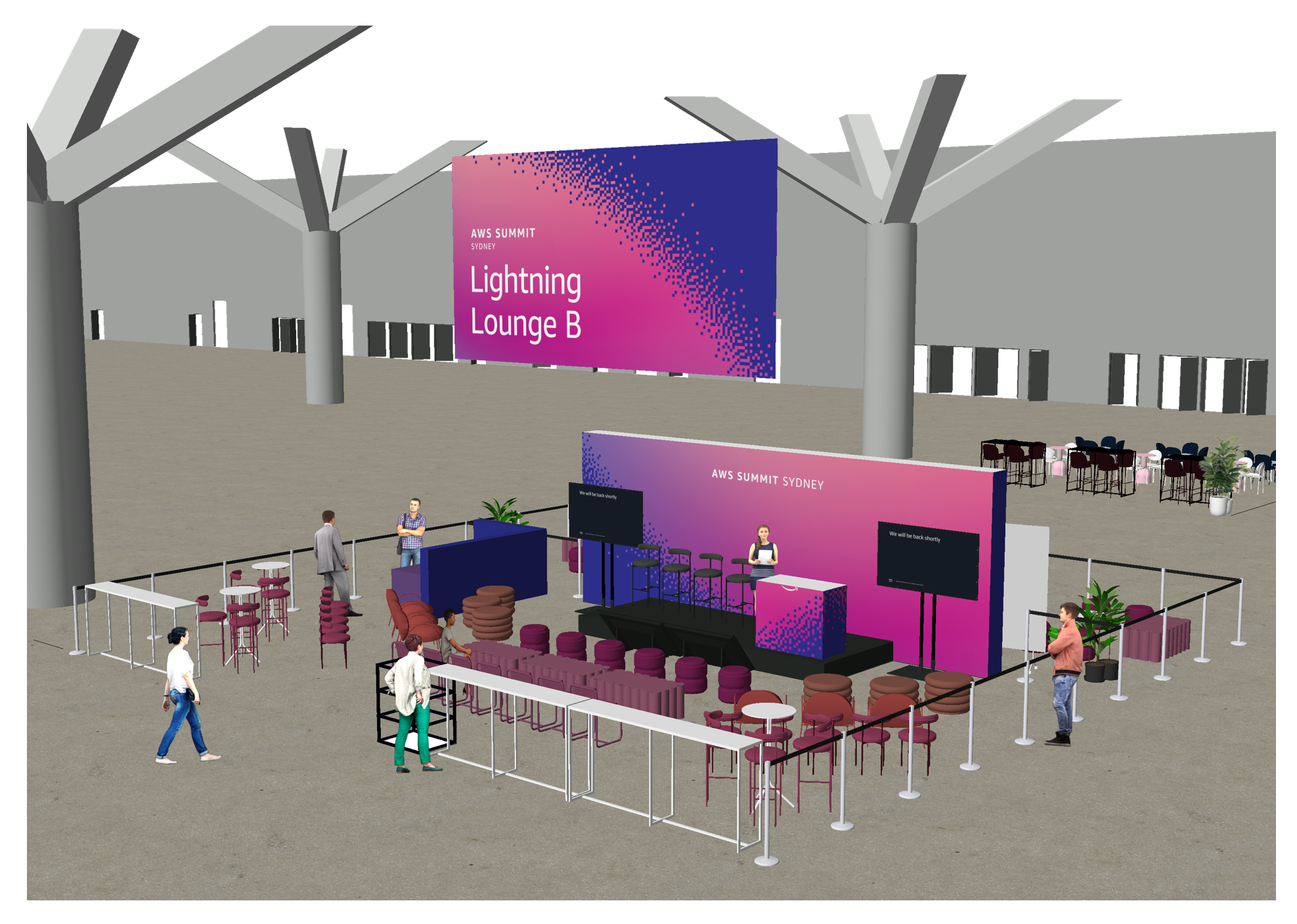 render this 3d model with realistic textures the context is an dark industrial expo location similar vibrant expo stands in the background and around the main stage bright background with polished concrete floor ceiling with barely visible trusses with several bright pink lights blurred business people with lanyard sitting in the space to watch