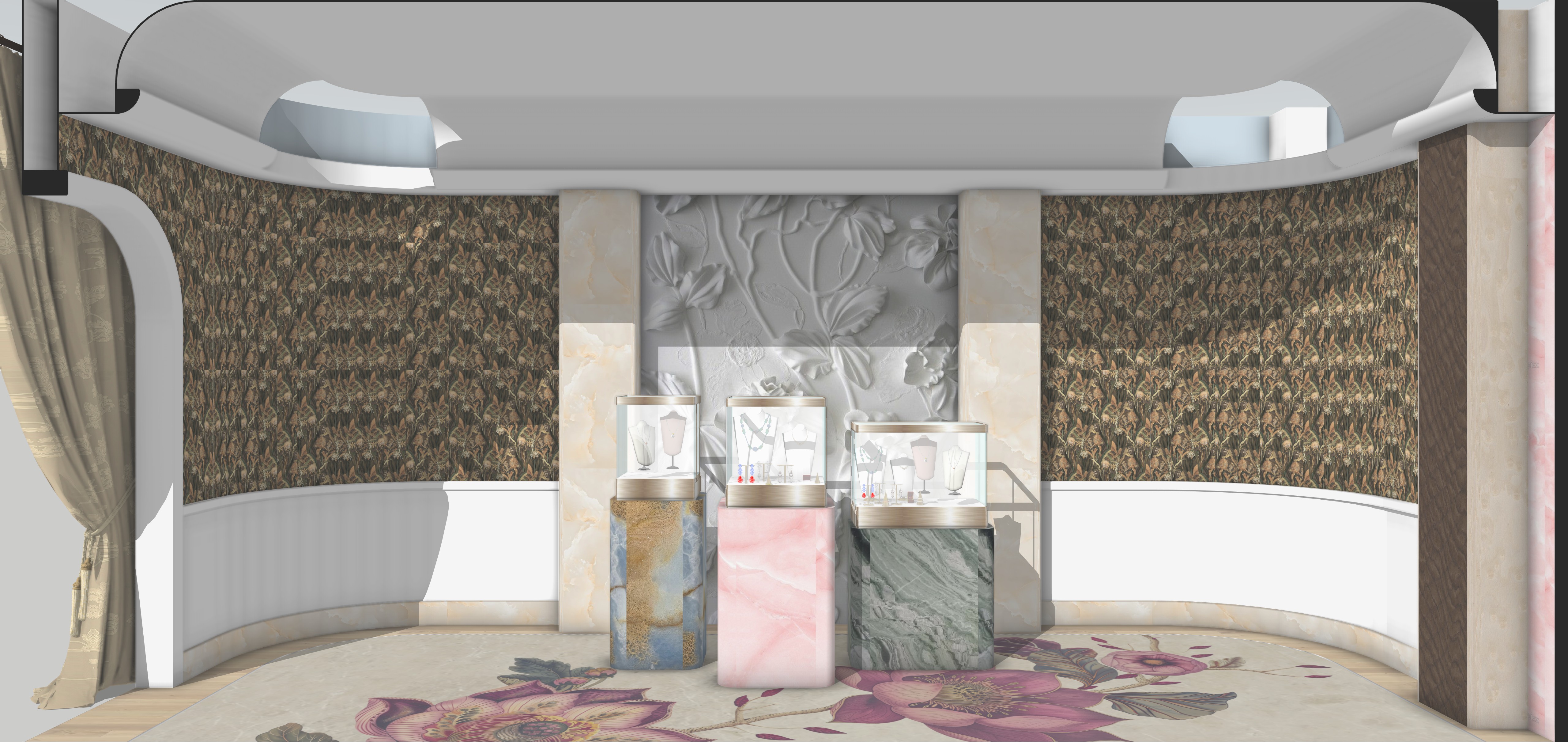 interior shot can you add jewelry inside the glass showcase and add lighting ambiance throughout the room