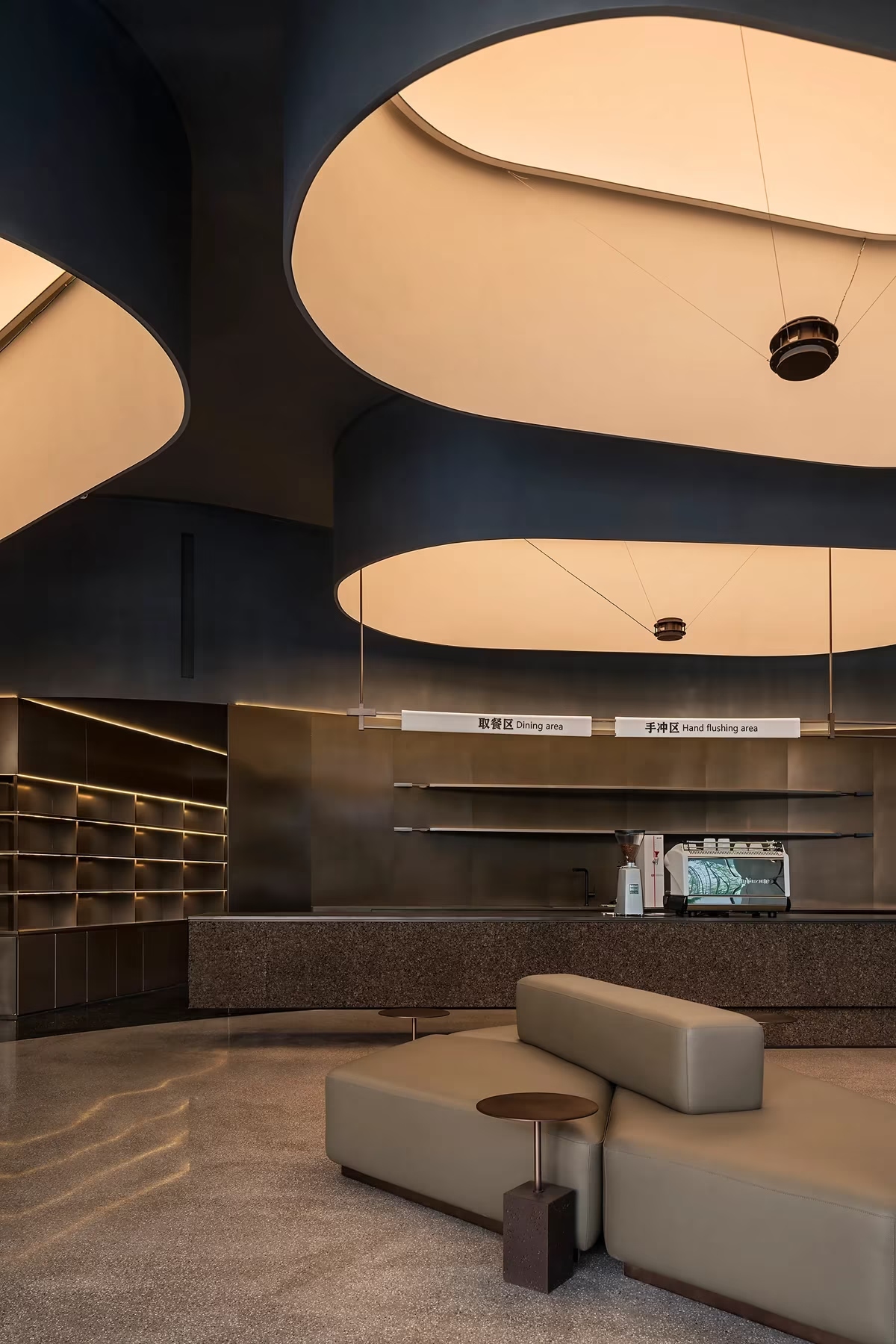 a photo of a minimalistic pool front view pool bowl exactly in the center relaxation areas with sofas and armchairs architectural ceilings and columns wide angle architectural photography