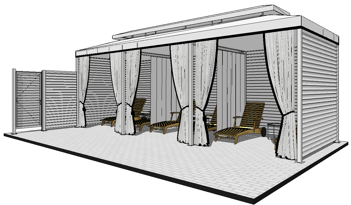 ultra realistic render of the exact same canopy structure shown in the reference do not modify or change any geometry proportions positions or design details all elements must remain exactly as they are a white luxury canopy with a white roof white heavy curtains with black contrast trim aluminum frame and vertical slatted pvc side walls inside several wood lounge chairs remain in the exact same positions add the following details without altering the structure place white and navy striped cushions and headrest pillows on each lounge chair bright clean midday florida sunlight with crisp shadows surround the canopy with a lush green lawn add tall tropical palm trees behind and around the structure hint of luxury west palm beach hotel architecture in the distant background clean white modern resort buildings soft glimpse of the ocean or blue water far behind the palms subtle not dominant clear blue sky rendering style hyper realistic high resolution focus on materials crisp white fabric black trim warm natural wood loungers do not add people do not change any dimensions or move any elements keep the canopy exactly as modeled