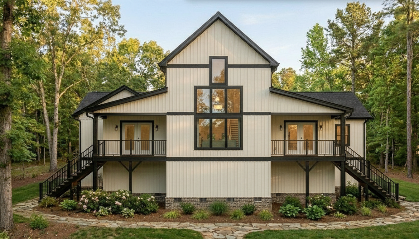 partly cloudy sky pella fossil windows deciduous trees in background off white color siding