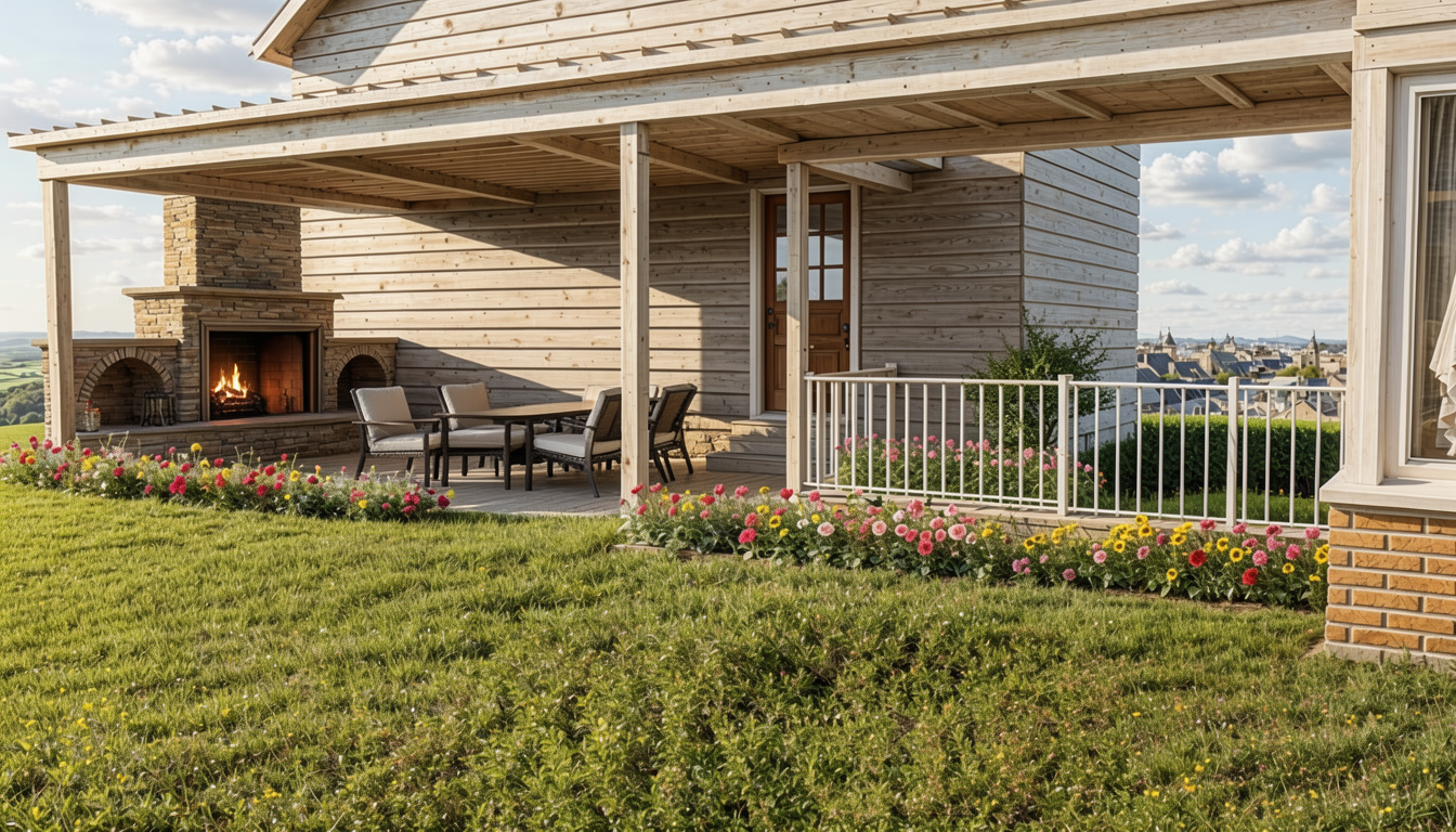 off white clapboard siding with white windows white trim in the truss roof white trim and 6 wide white corner boards asphalt shingle roof white truss in gables front porch covered composite deck white columns threes in the background and bushes near the house plants on the porch and some exterior wood furniture on the covered deck make the walkway and driveway earth tone patio pavers