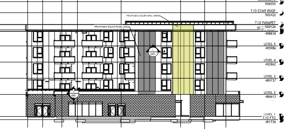 modernist exterior shot just add solid colour yellow is a solar wall the others are metal panel metal cladding is shades of purple light light architecture