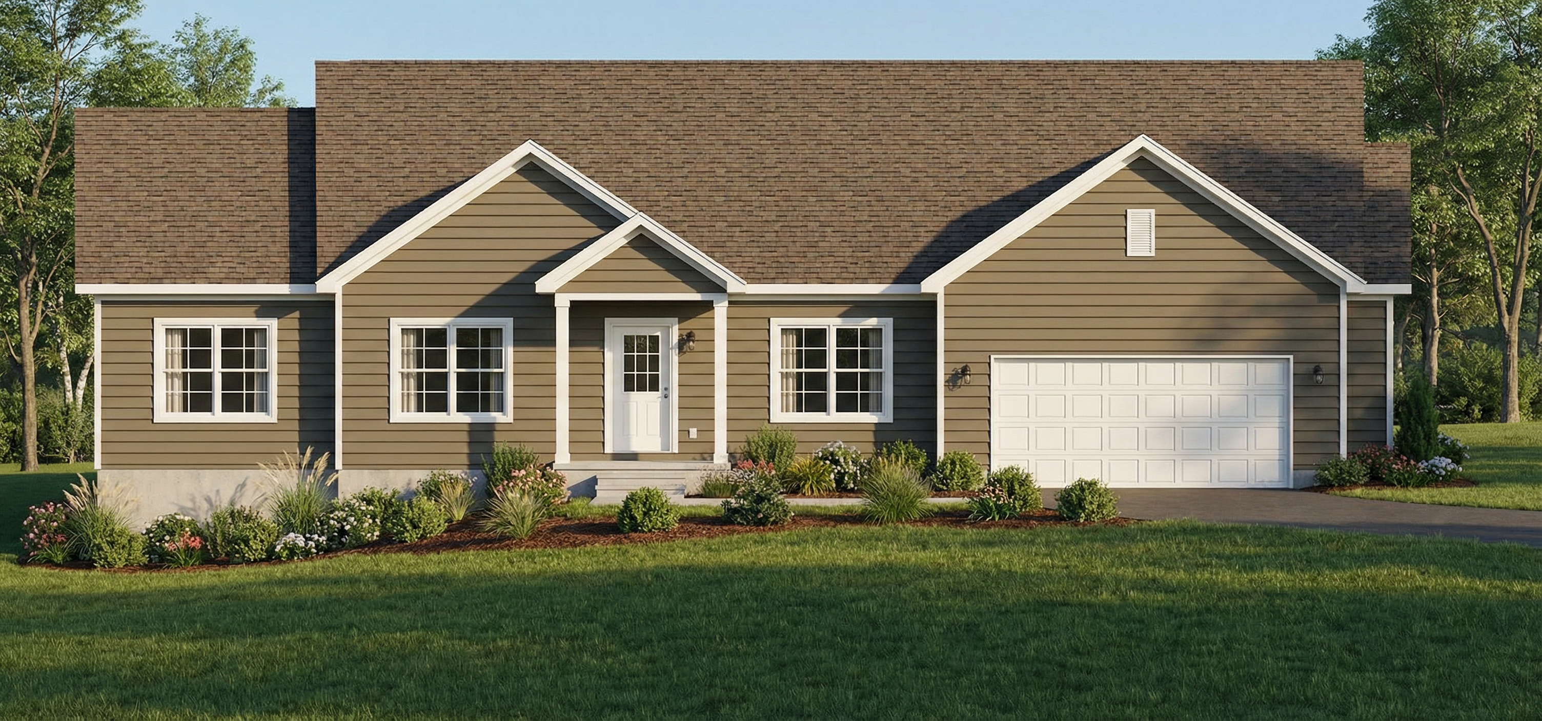 make as photorealistic as possible while keeping textures the same as selection professional landscaping in a lightly wooded scene with good lighting brown roof white trim white windows dark tan siding