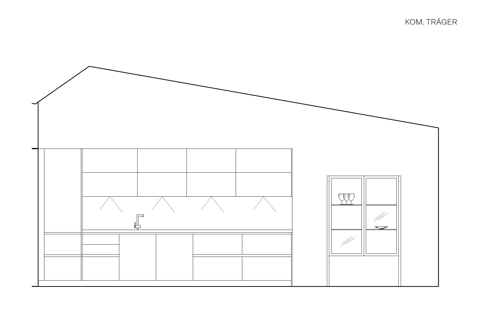 dark beige cabinets terrazzo countertop downlight from the upper cabinets dark blue glass cabinet on the right side fir wooden walls