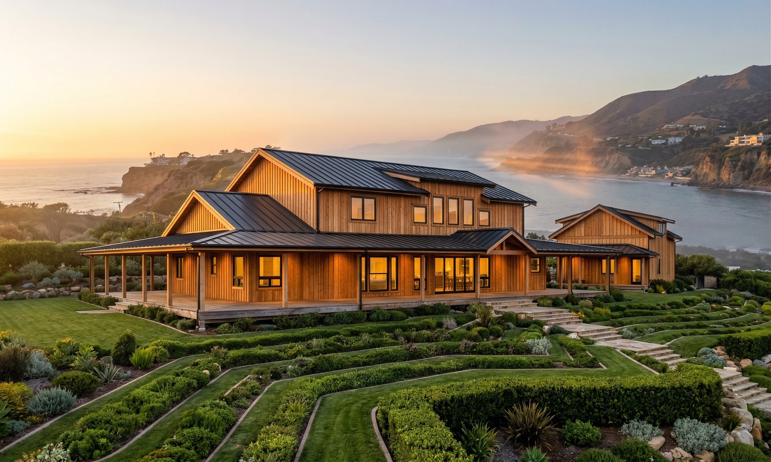 realistic look you want modern luxury interior with natural lighting photorealistic outdoor scene with soft shadows generate beautiful elevations renders with light inside with white stucco on front walls and black metal roof