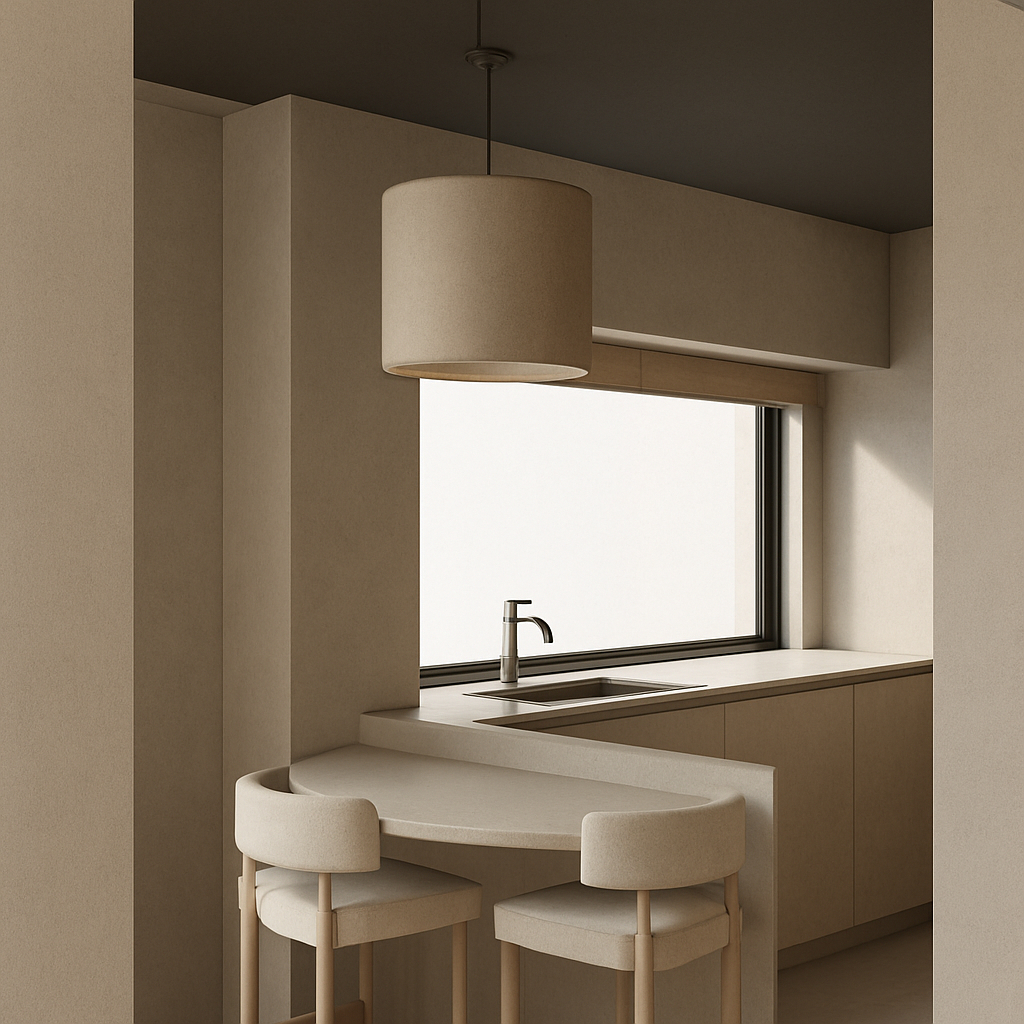 turn this image into a realistic photograph keep the indoor details and shooting angle in the image unchanged restore material details modern interior space design realistic surface reflections authentic indoor texture scattered light soft cinematic lighting bright space render a modern open concept living room and kitchen with a minimalist and elegant atmosphere the walls are a soft cream color creating a warm and inviting space use light oak wood for the flooring adding natural warmth the kitchen cabinets and dining table should be in a rich walnut finish providing contrast include sleek black appliances for a contemporary touch the armchairs and sofa are upholstered in a light beige fabric exuding a cozy vibe add subtle accents of greenery for freshness the lighting should be soft and ambient with pendant lights above the kitchen island in brushed metal the overall mood is sophisticated and serene with natural light streaming through large windows