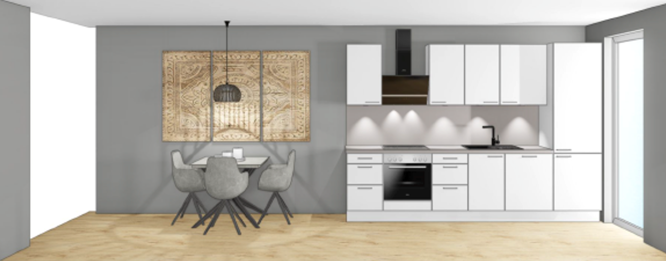 moderne luxuri se einbauk che im italienischen designerstil minimalistisches high end design fronten in mattem wei supermatt soft touch absolut gleichm ig schmale mittige horizontale griffleisten aus dunklem metall flach integriert pr zise hochwertig arbeitsplatte und r ckwand aus hochwertigem naturstein in warmem beige mit extrem feiner homogener kaum sichtbarer maserung sehr ruhig nahezu einfarbig matte oberfl che keine kontraste k chenarbeitsplatte mit wenigen kuratierten accessoires kr utertopf massives holz schneidebrett mit artischocken minimalistisch und hochwertig bild ber esstisch ersetzt durch ein modernes abstraktes minimalistisches gem lde in gleicher form und gr e aber nicht unterteilt hochwertig ruhig edel minimal boden aus hochwertigen eichendielen parkett in wildeiche breite lange dielen geb rstet und ge lt nat rliche dezente maserung kein fischgr tparkett wand nach links in den flur verl ngern photorealistic ultra detailed archviz global illumination ambient occlusion soft shadows natural lighting cinematic lighting 8k render luxury interior design clean composition no clutter