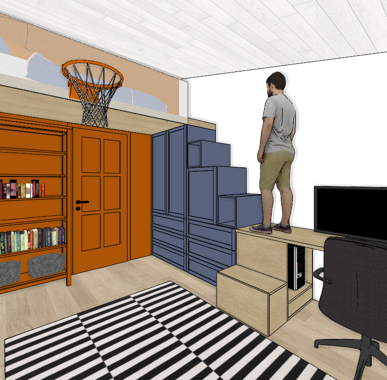 human is a teenager no beard backwall in painted dark orange wooden door is painted in same colour also bookcase is painted in same colour loft has a safety glass on the side bed on the loft has blue bedding do not change colours and materials wardrobe is blue bottom steps and desk and foor is light wood colour