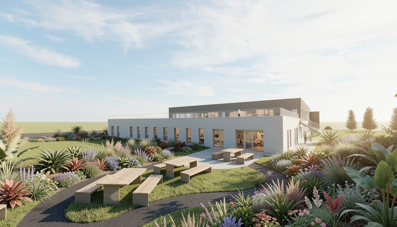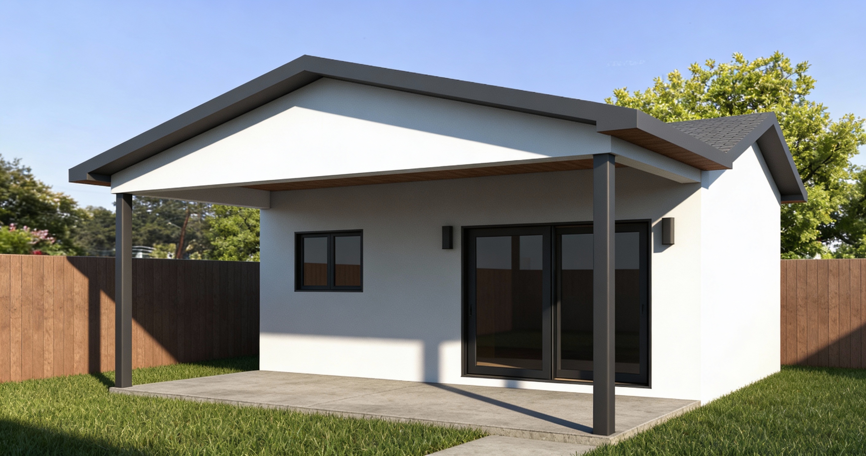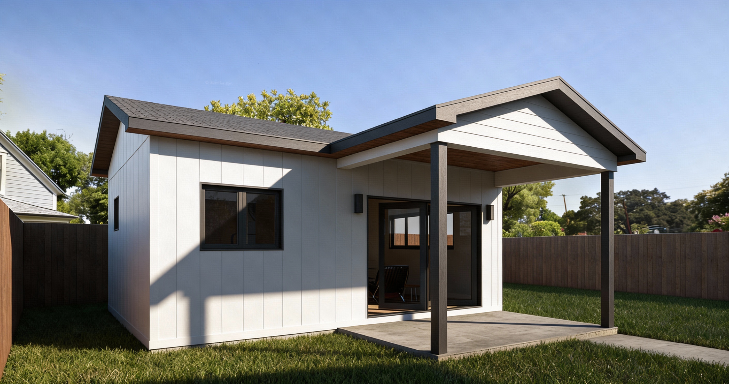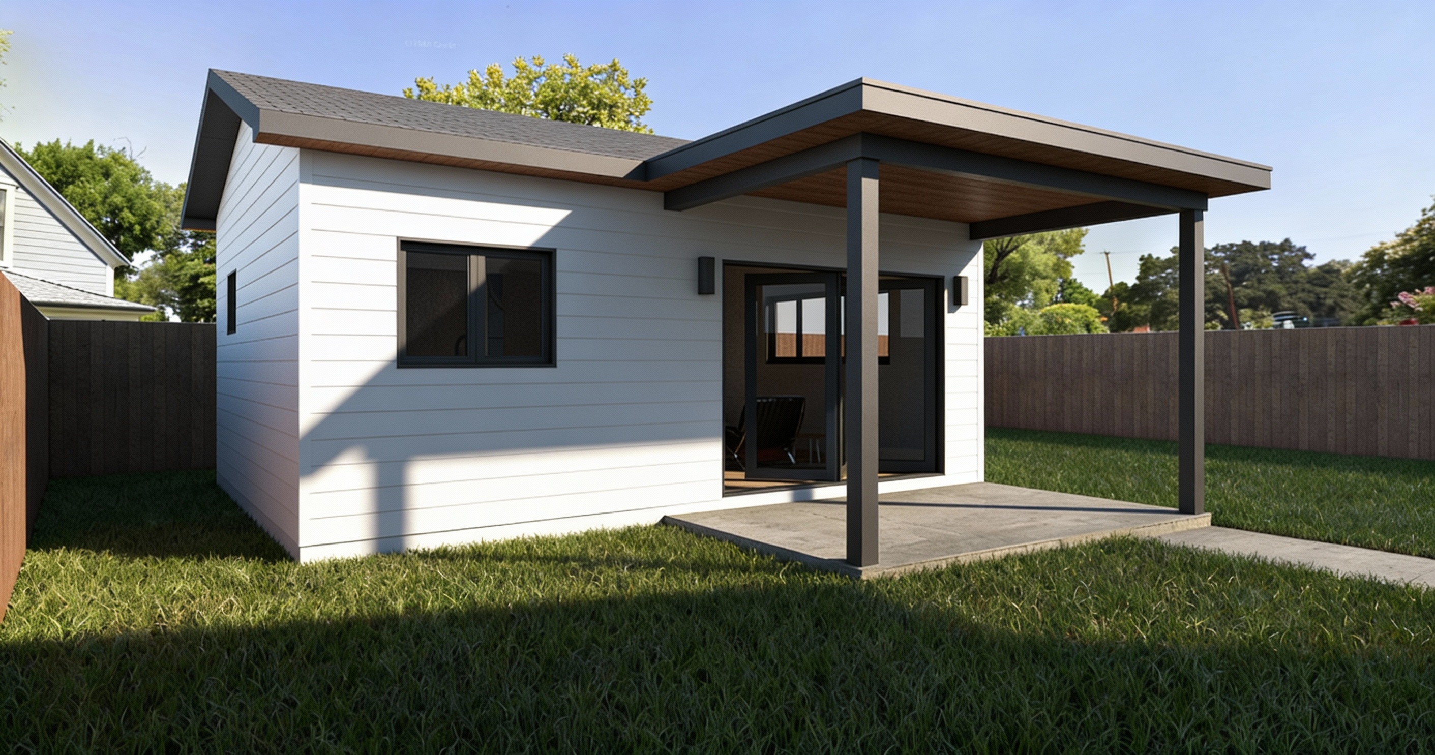 redesign adu with a modern look with an increased wider flat canopy that extends full width of adu make the canopy wider to the full width of adu do not show any beams exposed that support the canopy