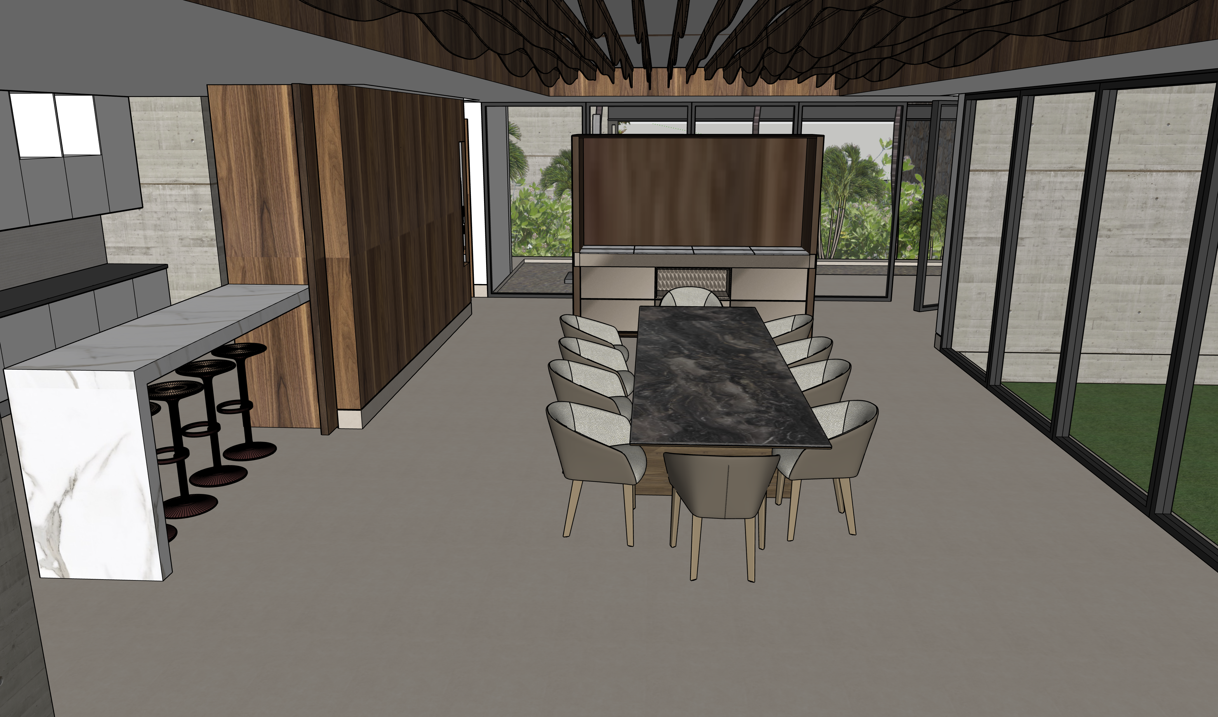 residential design minimalistic contemporary approach large marble table with dark shiny stone and wooden wavy baffle ceiling with indirect lighting beige andreu world chairs wooden wall covers integrated large sliding door for the kitchen burgundy kitchen stools beige large format ceramic tiles central furniture in wood and marble with indirect lighting facing to the large table