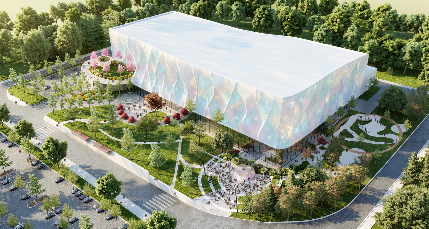 retain everything about the image just update the roof extend the wave pattern of the fa ade to the roof in a way that it appears like it wraps the roof and the fa ade seamlessly into one make the transition from the fa ade to the roof very seamless retain the original fa ade qualities