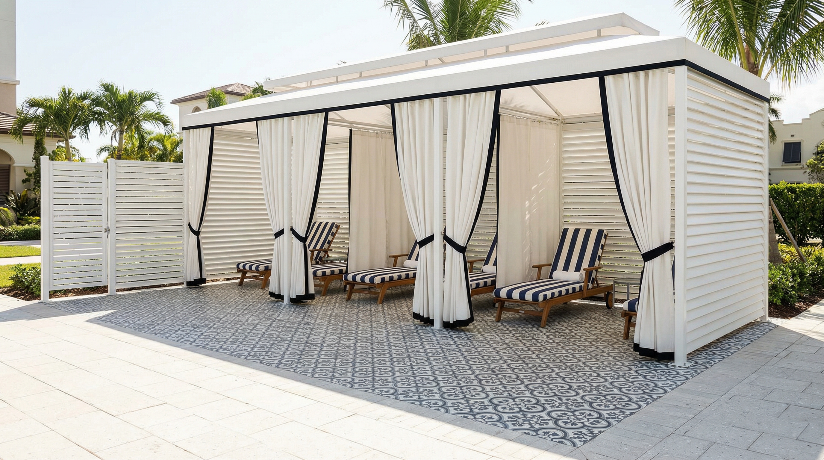 exterior shot create a garden under a glass fibres roof introduce with different greenery areas around