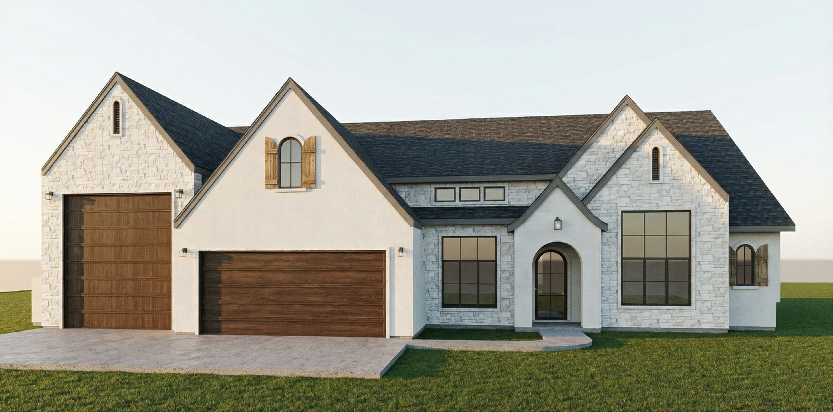 barndominium exterior shot a serene modern countryside scene featuring a contemporary three story house with olive light green board and batten siding wood trusses and stone column bases and large bronze framed windows the house is surrounded by vibrant lush green grass and towering trees with dense foliage in varying shades of green a light blue sky with soft white clouds creates a peaceful backdrop while the foreground showcases a gravel driveway nicely landscapes the atmosphere is tranquil and picturesque capturing a sunny peaceful afternoon architecture