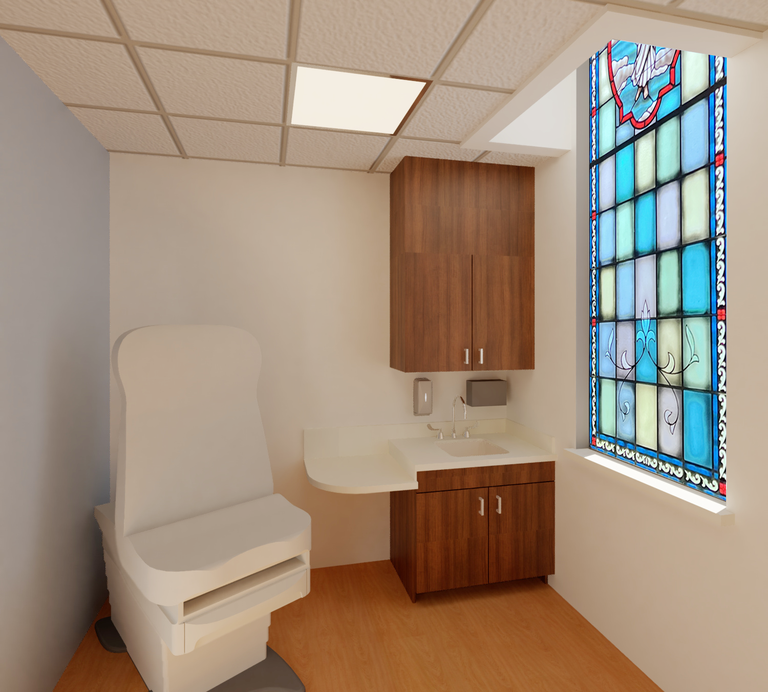 exam room in a medical clinic with stained glass windows the light shining in the space from the stained glass window is tinted to match the color of the window