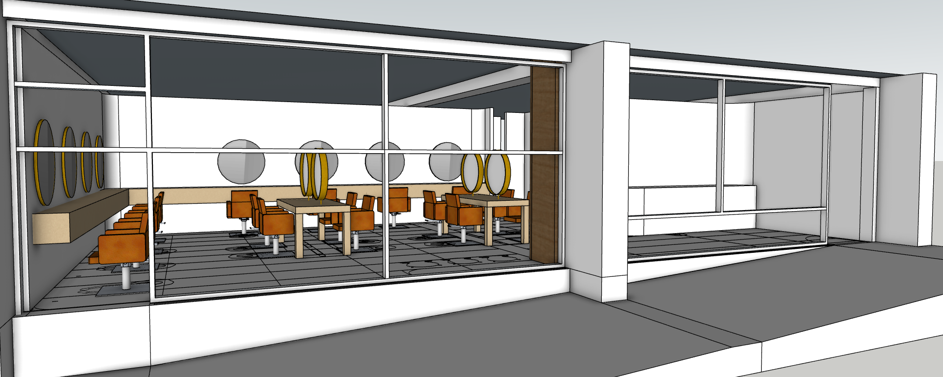 hairdresser cream concrete render walls timber shelves small amount of plants gold trim mirrors brown leather chairs point of sale or right hand curved wall glass in windows
