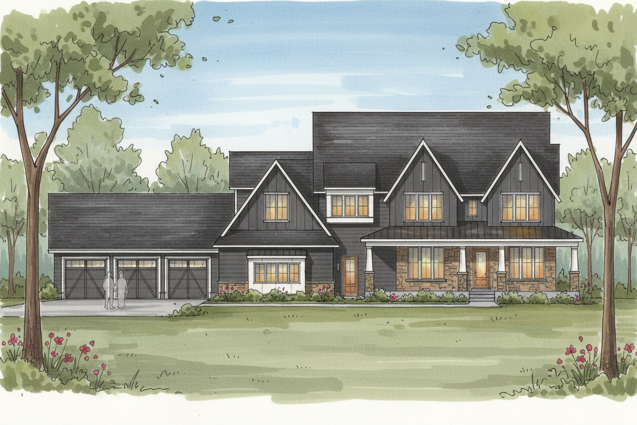 generate a high quality photorealistic render of the provided architectural elevation drawing preserve exact geometry proportions window spacing and material layout render at 4k resolution with ultra realistic daylight lighting clear sky soft shadows ambient reflections ensure all exterior materials colors and textures match the client s specifications exactly match each component as follows body color trim color brick color windows front door roof garage color gutters metal roof shutters agreeable gray sw7029 agreeable gray sw7029 shadowstone black roycroft copper red sw2839 moire black agreeable gray sw7029 black not applicable not applicable photometric lighting should highlight color accuracy and realistic reflectivity use global illumination and hdri sunlight calibrated for afternoon warm tone maintain true color fidelity consistent exposure and physically accurate shadows add context elements landscaping realistic lawn shrubs and shadow cast trees suited to suburban setting driveway and walkway concrete or paver per style background complementary skies matching exposure no distortion or overenhancement output a single photorealistic rendering that is architecturally faithful visually balanced and color accurate to the above specifications