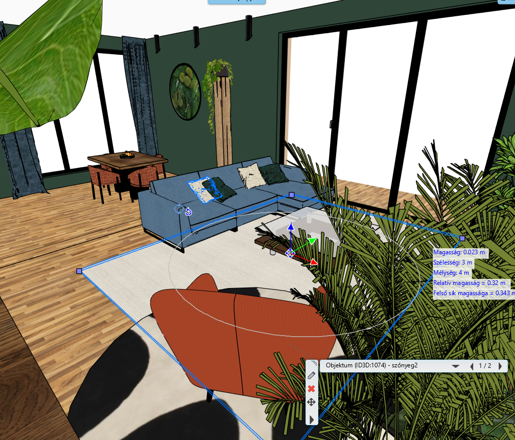 l gy loft hangulat a fal ral6005 s t tz ld a paketta t lgy a polcok di sz n ek a fotel s a sz kek terracotta sz n ek a fotel alatt fekete feh r k rsz nyeg van az ablakon t magasr l parkra l tni a s t t t f gg ny s t tk k mint s