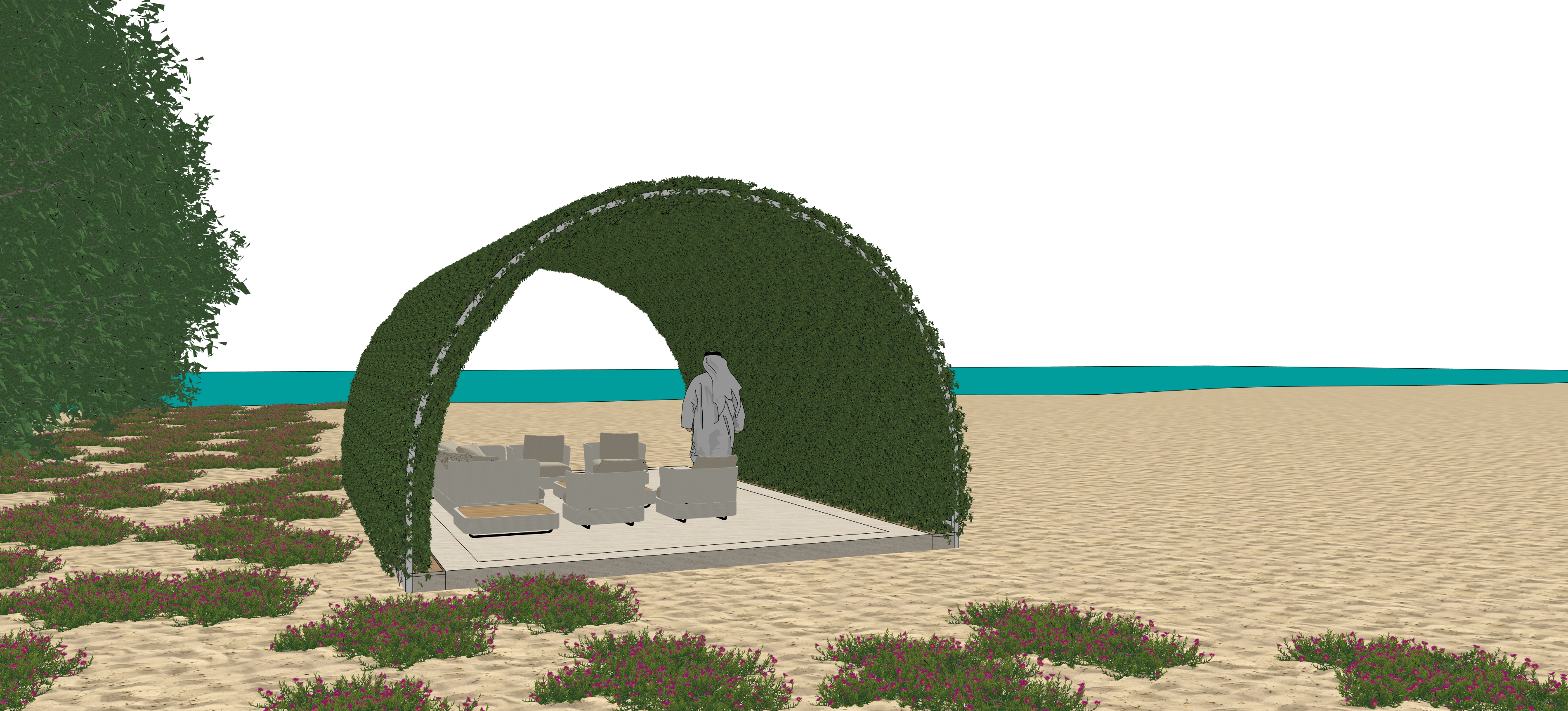 render a photorealistic 3d perspective of this beach pavilion pavilion covered in lush ivy foliage and set on a beach with turquoise water and surrounded by morning glory planting do not change the view a vibrant clear sky with light atmospheric depth render in hyper realistic architectural visualization quality 16 9 aspect ratio