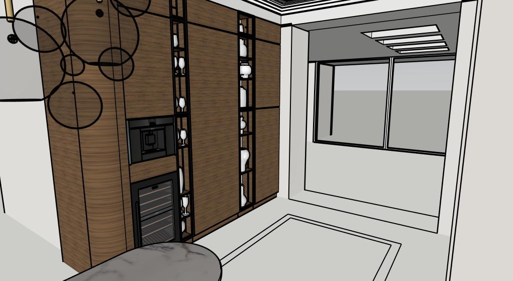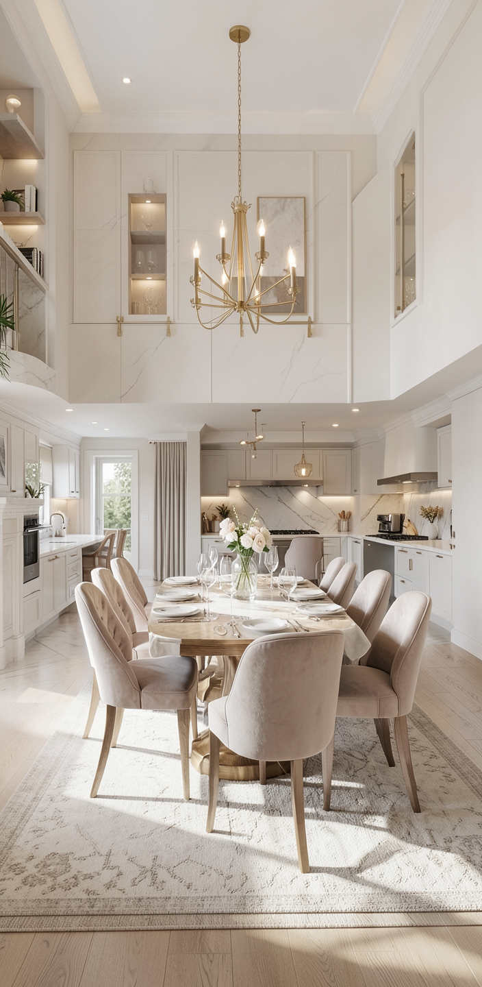 prepare photorealistic render this dinning room open for kitchen do not change dimensions this dinning room got dimensions 5 x 5 5 m with 3 m hight design there a table for 8 style modern classic light colours luxury style