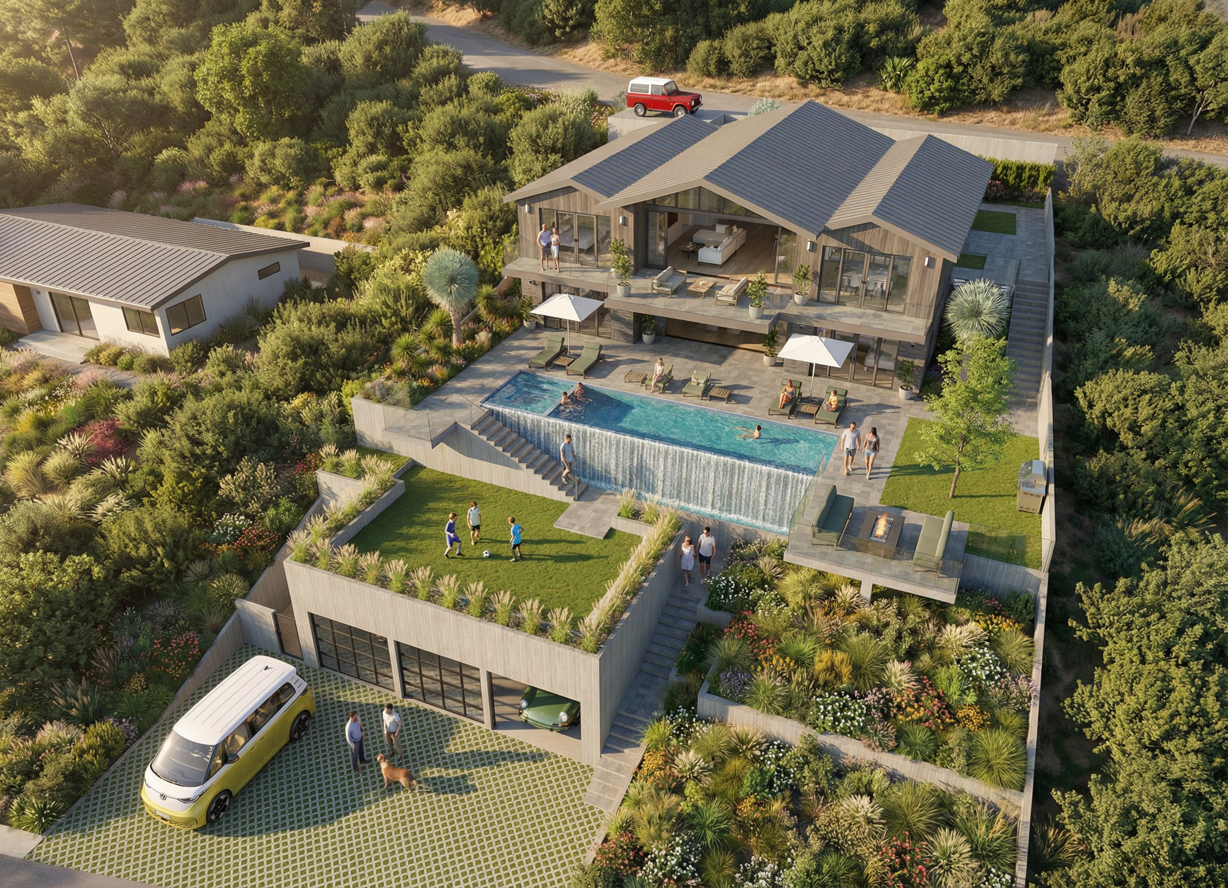 add groupings of california native plants with grasses and flowers to the yard areas enhance the waterfall effect at the infinity edge of the swimming pool along the full length of the pool add a 2025 model vw buzz parked in the driveway on the left side make the entire driveway surface grasscrete add 3 children playing with a soccer ball on the lawn above the garage add people around the pool and swimming in the pool add a man and a woman walking up the stairs on the right side of the garage add a man walking down the stairs next to the waterfall add groupings of bushes and trees to the adjacent landscape like the area around malibu lake add a man and a woman looking out from the center of the balcony at the upper level of the house enhance the roadway at the upper level of the view to make it look more realistic make it one lane wide and partially obscure it with bushes and trees open up the right side garage door and add an orange colored 1972 porsche 911 parked halfway inside the garage add 2 men on the driveway talking to each other with a medium sized dog sitting next to them add a small ranch style modern home with a low pitched metal roof on the adjacent parcel on the far left side of the view and partially obscure it with trees and plants and a little fog the planter along the outer edge of the garage walls keep the type of grass that is already in the view add a man and woman sitting facing the fire pit on the right sofa add some weathering effect to the board formed concrete material of the garage walls and other retaining walls add a little fog effect to the right side of the view on the adjacent land use the original image vertical wood siding as a reference and enhance the look of the material