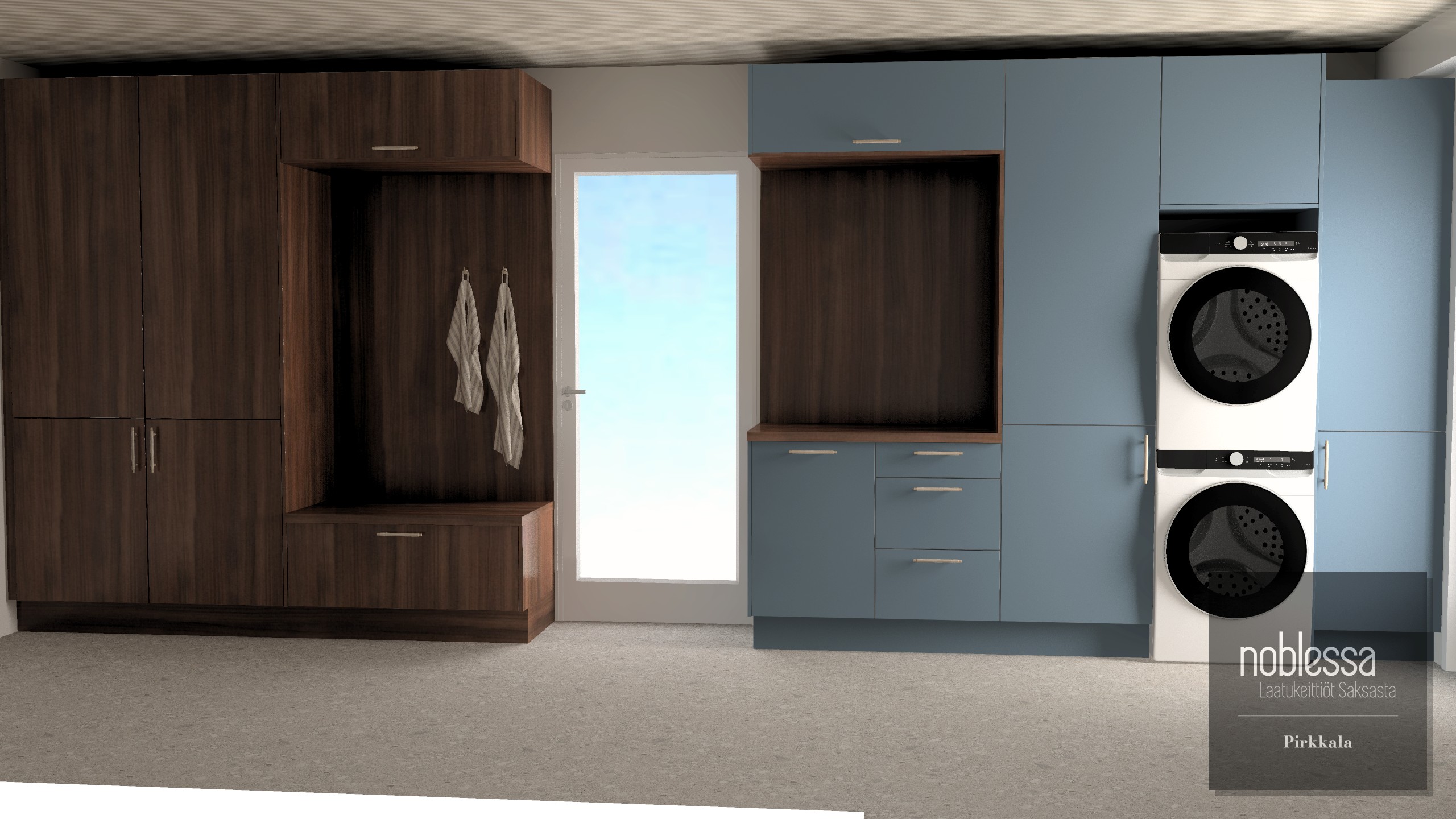 fixed furniture noblessa milano walnut and noblessa dark blue the floor is tiled with 60x60 abitare ciottoli tabacco under the upper cabinet on the right side there is a clothes rail covered with brown leather by theofils