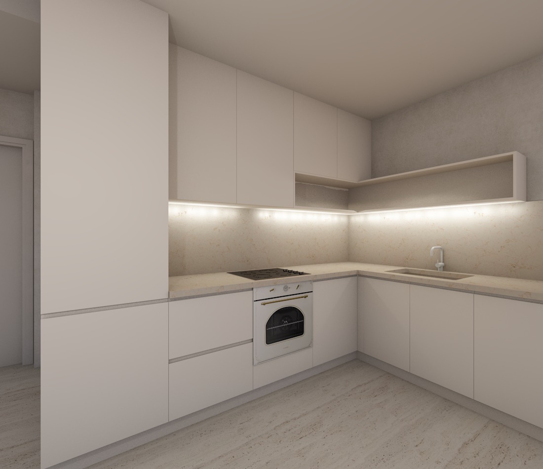 create a highly realistic render of a modern kitchen in a coastal home with a calm warm and refined atmosphere the design is minimal and cohesive inspired by seaside living with a soft neutral palette that evokes natural light sand tones and a relaxed elegance the kitchen layout is linear with an l shaped extension featuring clean handle less cabinetry in a light beige tone with a matte finish the surfaces appear smooth and seamless the countertop and backsplash are in a natural light beige stone reminiscent of sand and coastal textures with subtle variations and a soft matte finish a hidden led strip is installed beneath the upper cabinets providing soft indirect lighting that gently illuminates the backsplash and enhances the warm ambient atmosphere in the foreground