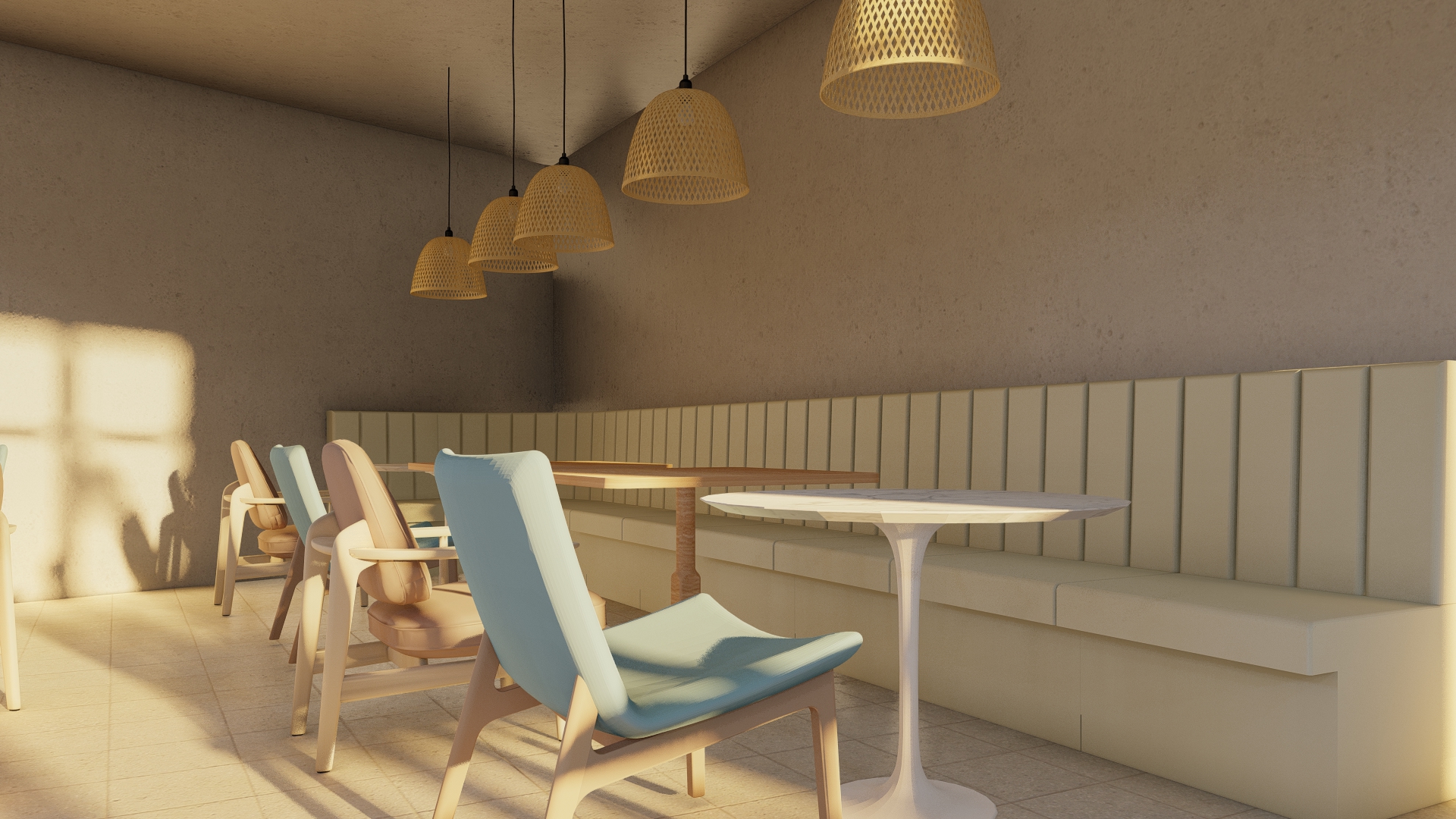 interior shot zadr i isti kadar proporcije raspored i dimenzije prostorije ni ta ne mijenjaj ni ne pomi i kao glavnu zidnu oblogu koristi dekorativni cement microcement za moderan prirodan izgled oboji kau u zeleno kao istolice neka neke stolice budu smede na zidove dodaj biljke i vertikalno i vise e uredno i prirodno raspore ene na desni zid postavi televizor ravnog ekrana koji se skladno uklapa u prostor na zidove dodaj ukrase u istom stilu kao na prilo enoj slici elegantne minimalisti ke mediteranske osvjetljenje kompozicija i kvaliteta slike moraju ostati identi ni