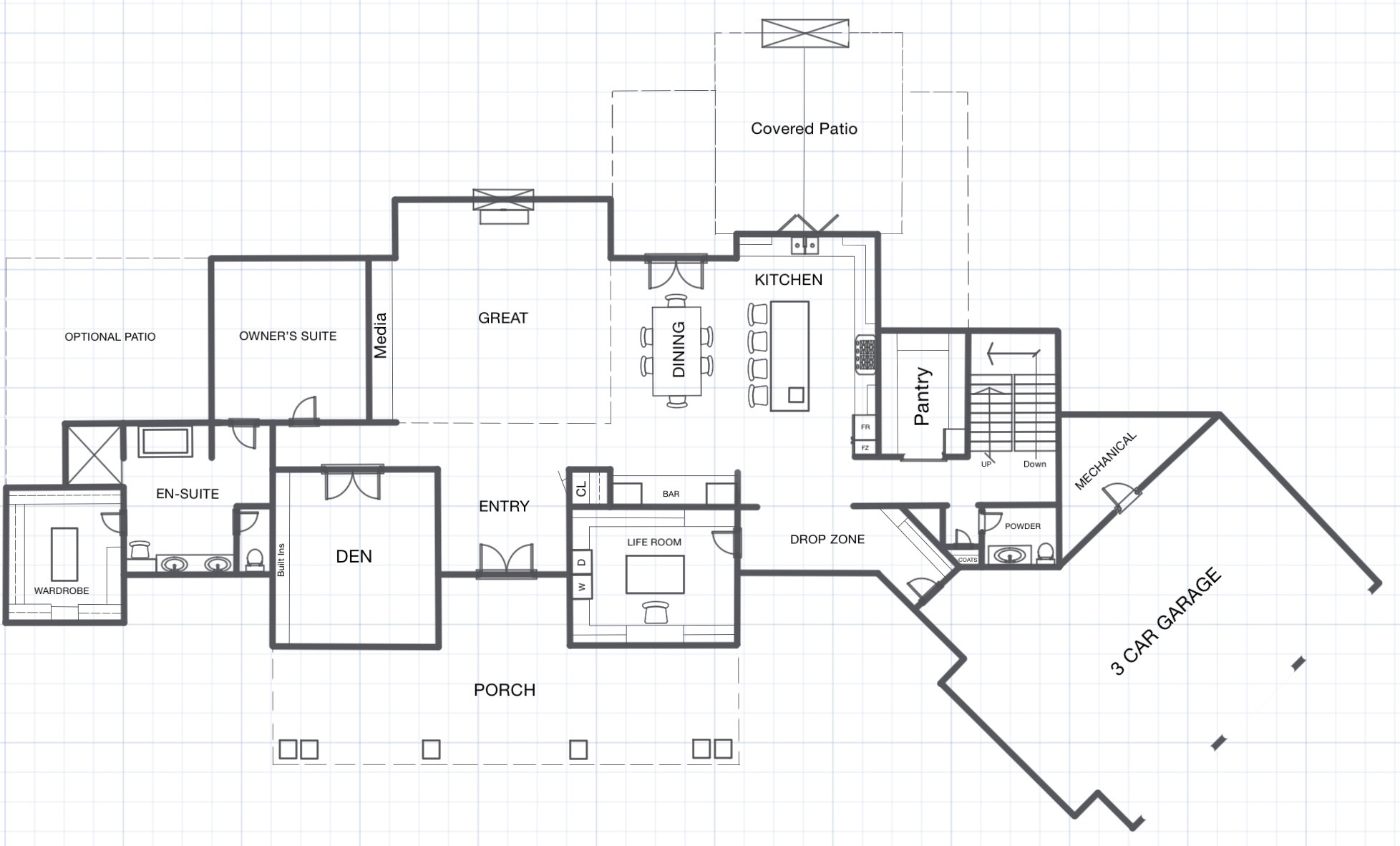 create hand rendering of this floor plan complete with walls and doors keep word labels as shown