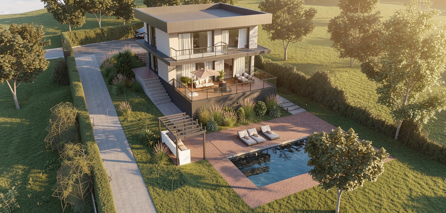 modern minimalist architecture abstract geometric design white tones fenece in concrete walls and stainless steel fence serene sky in gradient of light blue soothing and airy atmosphere calm natural and soft lighting