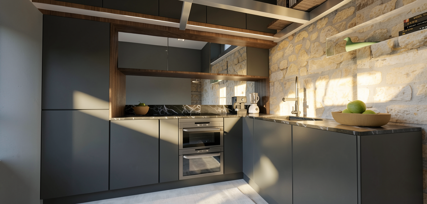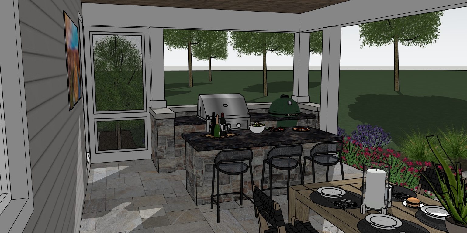 partly cloudy sky some deciduous trees in background gray siding white windows